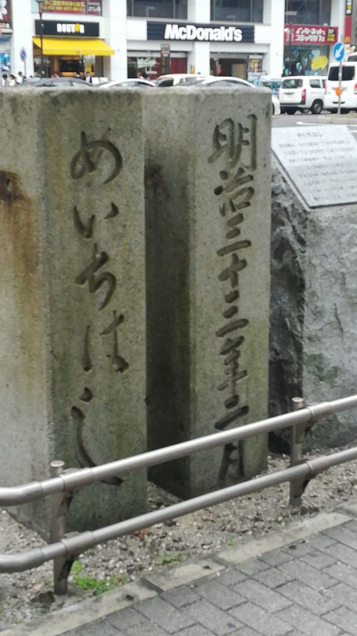 笹島の交差点のすぐ南側にあります。歩いていてたまたま通りかかって何だろうと思って見てみました。名前の通り明治橋があったことを指し示すもののようです。昔このようなものがあったといっても本体の跡がうかがいしれないのであまりピンとはこないです。