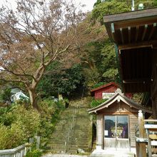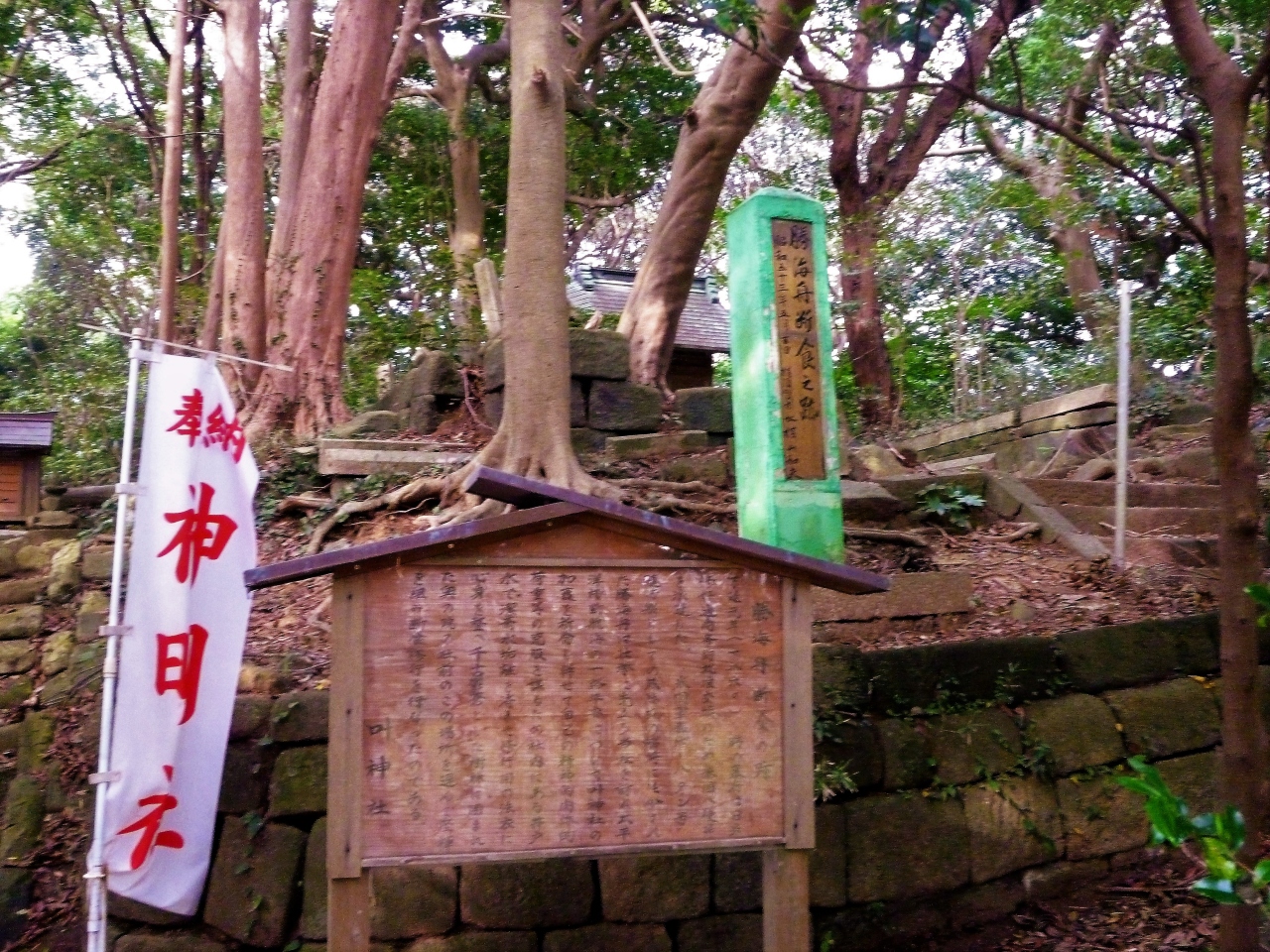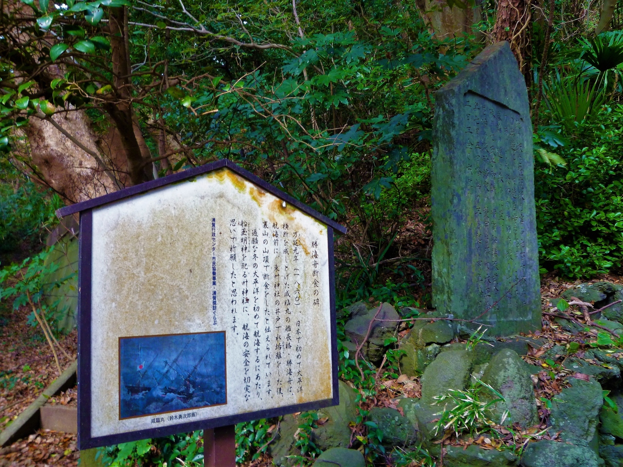東-叶神社(浦賀湾の対岸には西-叶神社が,,)の拝殿から奥に石段が/結構急な石段を登り森の中を頂上?を目指します(途中には立札・矢印→も)。ありました[勝海舟断食之跡]…ただ`屋敷`は残っていないので旧市長の石碑が。頂上には叶神社の塔頭/浦賀各団体の記念碑/その昔の`浦賀城!`立札が,, 備考)10月中旬ですが、碑に近づくと`やぶ蚊`が刺しました。