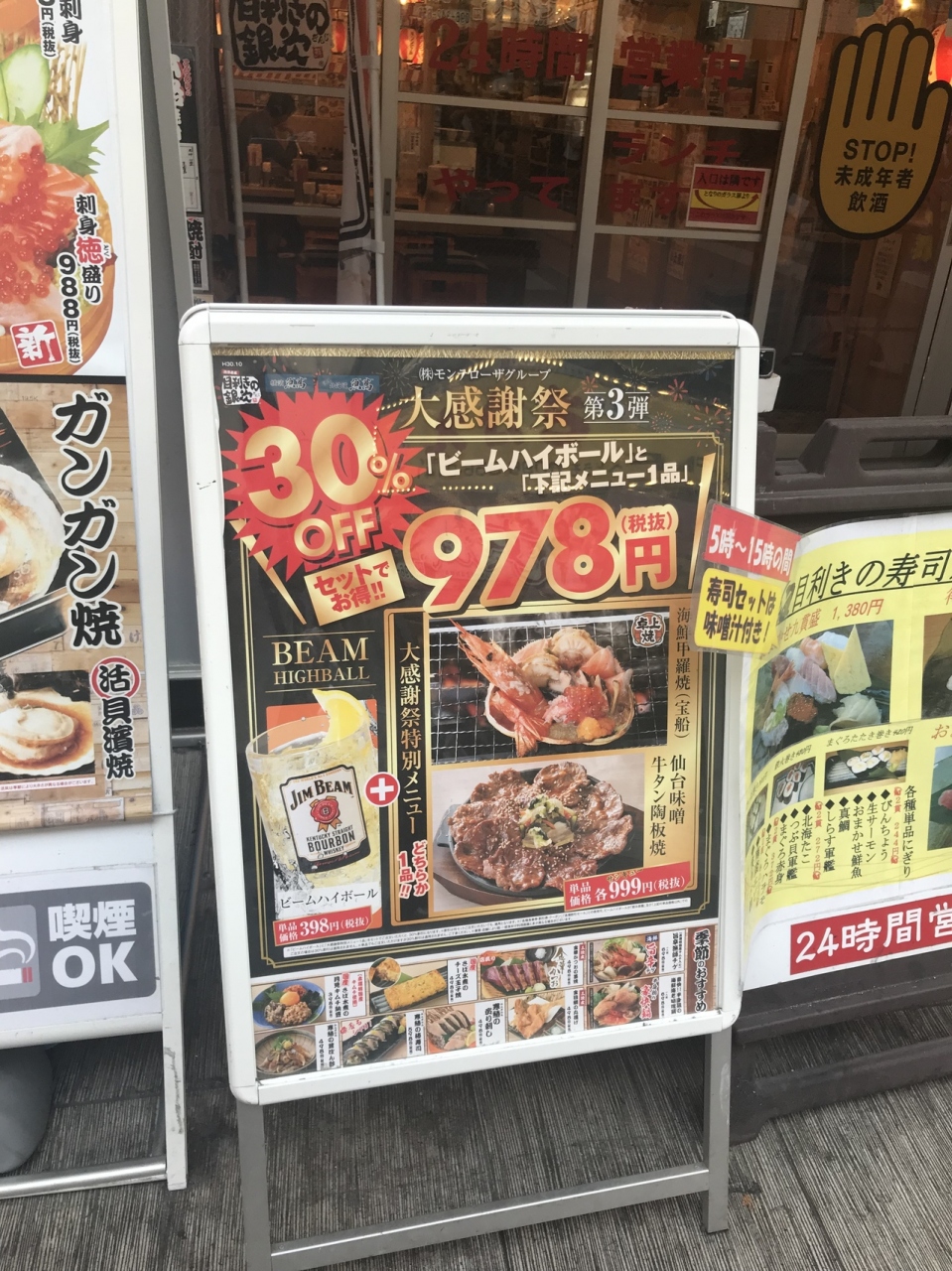 熊本市アーケード街にある、海鮮の目利きの銀次です。大感謝祭第3段は、ビームハイボールと仙台みそ牛タン陶板焼きか、エビやいくらにうに、ホタテやシャケなど豪華な海鮮の甲羅焼きかどちらか選べて978円です。