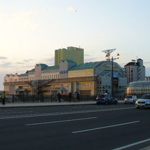 平日の夕方5時ごろ立ち寄ってみました。外は岸壁に立ち並ぶ街灯に灯がともりなかなかいい雰囲気ですが、建物の中はお土産屋が数店営業中で団体さんがバス一台着たのかにぎわっていましたが、上の階はほとんど人もおらず寂しげな様子でした。