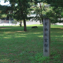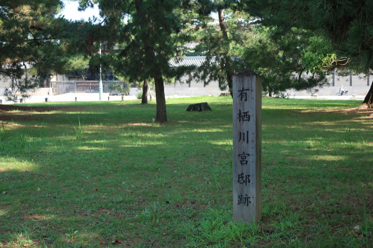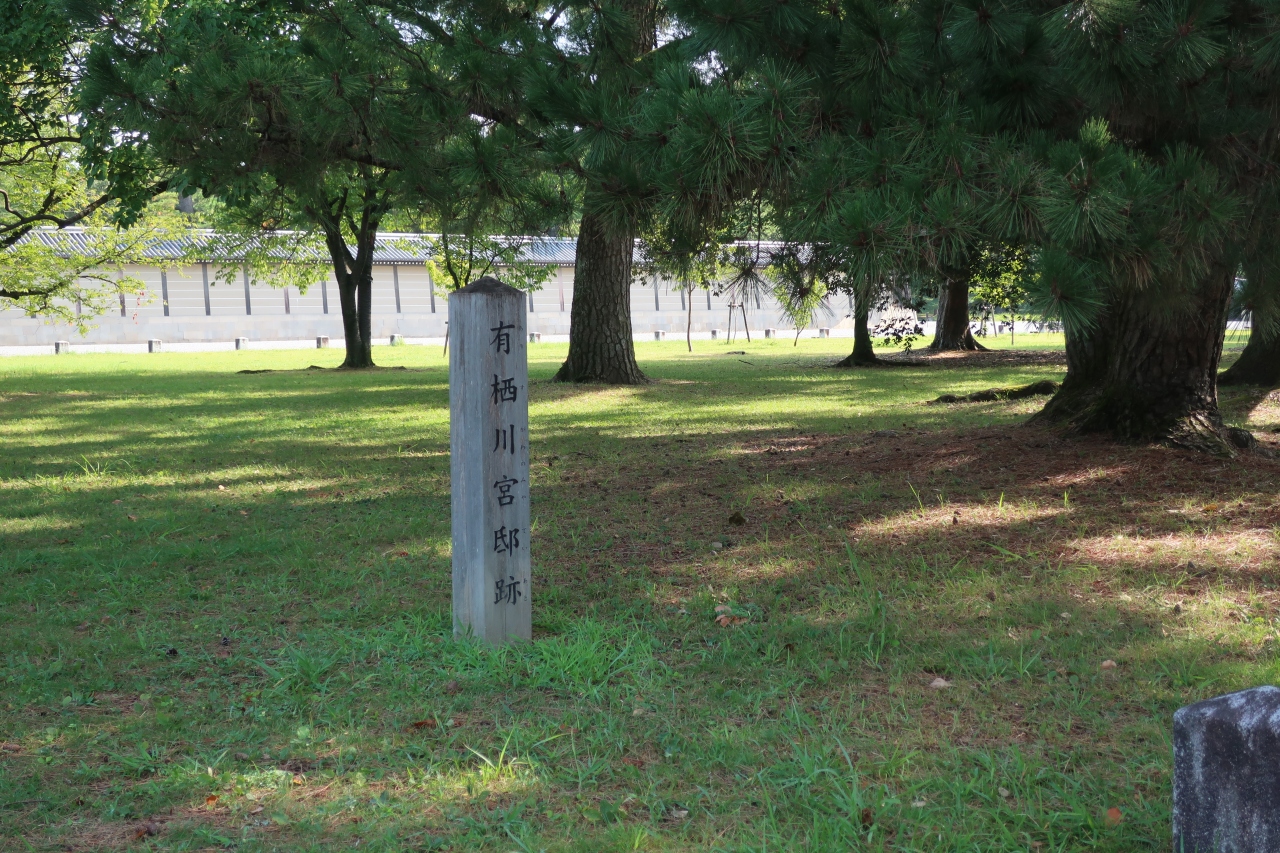 京都御所の建礼門の東南東の松の木が植わる緑地に有栖川宮邸跡の碑が建てられています。有栖川宮家は閑院宮家、伏見宮家、桂宮家と並ぶ四親王家の一つ。