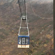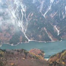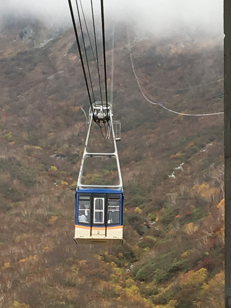 立山方面からくると、大観峰から黒部湖に向かって下りて行く風景は見事でした。霧が出て大観峰の展望台では、うっすらとしか見えなかった紅葉の黒部ダムと黒部湖が見えました。標高差があるので、大観峰で見えない時も、ロ一プウェイでは見えるようです。