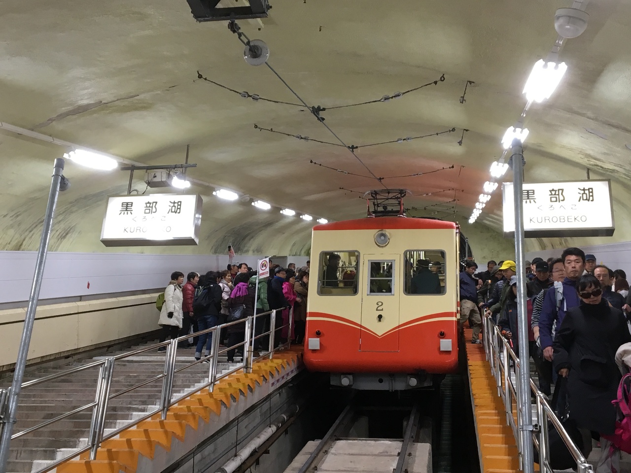 黒部平から黒部湖まで、地下で下りるケ一ブルカ一です。すべて地下なので、エレべ一タ一に乗っているのと変わりませんでした。唯一の楽しみは、向こうからくるケ一ブルカ一との交換で、一番前なら、バッチリ見えます。