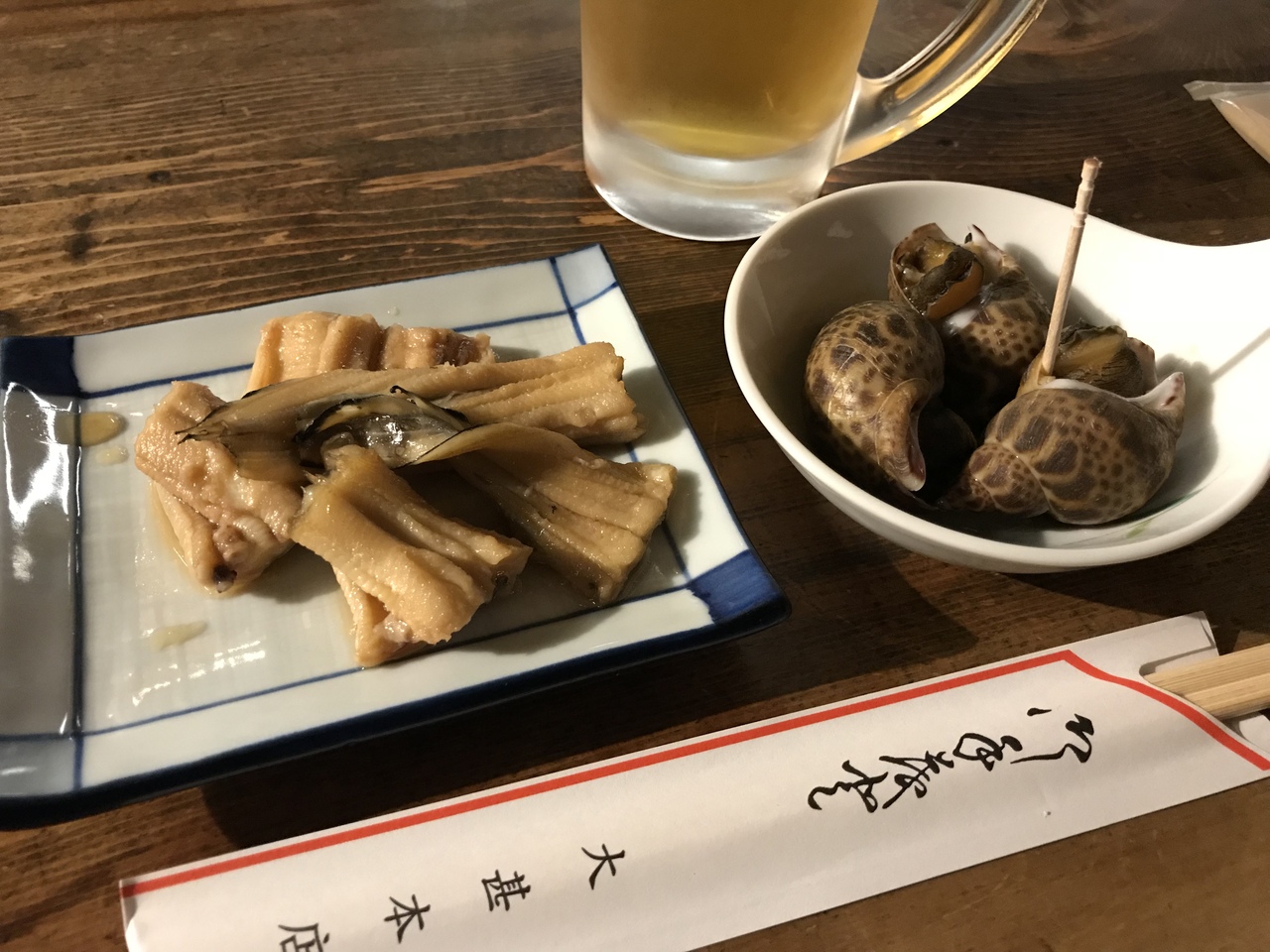 建物は古くて懐かしい雰囲気だが店内も営業スタイル含め良い意味で昭和の居酒屋。惣菜は自分で選んで勝手に取っていく。値段は皿の種類で決まっているがどの皿がいくらなのかはわからない。そのため帰る時までテーブルの上は皿や徳利はそのままで、会計を依頼するとナントそろばん!で計算してくれます。惣菜、刺身はどれも美味しい。酒は菊正宗と賀茂鶴の二種類しかありませんがそれで十分。不便さはあるがそれゆえ時代も含めトリップできるお店です。