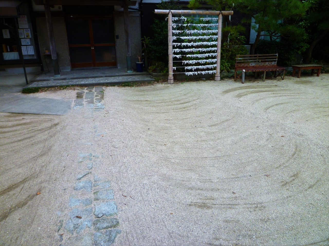 `勝海舟断食之跡`を見たさに[東叶神社]の奥山に登りました。 さて`跡`を見終わって東叶神社の拝殿にお礼の参拝し、振り返ると(出口へ) なんと参道に竹箒で枯山水の模様が!(入口時は気付かなった) つい最近のTVで`銀閣寺の参道には朝早く竹箒で枯山水の模様が!/参道は見学者が踏みしめて通るので知らないのはもっともですが,,`と感動したあとに,,,この[東叶神社]も,,。(もしかして見学者には黙って全国の神社は竹箒を,,?)