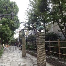 靖国通りの区役所前信号の先に急に木立が見え、落ち着いた遊歩道が見えてくる。