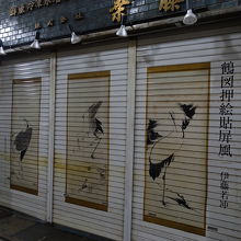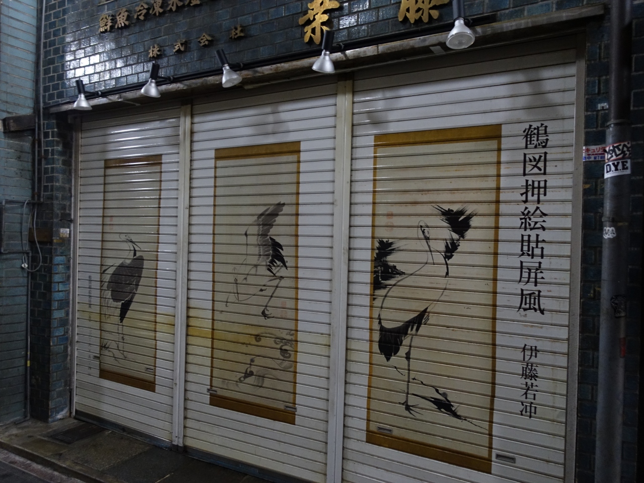 「京の台所」として観光客にも人気の「錦市場」ですが、早い時間に店じまいをするお店が多いです。閉店後の楽しみと言えば、閉じられたシャッターに描かれた伊藤若冲の浮世絵です。伊藤若冲が、かつて錦市場にあった青物問屋の長男だったからだと思われますが、とてもいいアイディアだと思います。