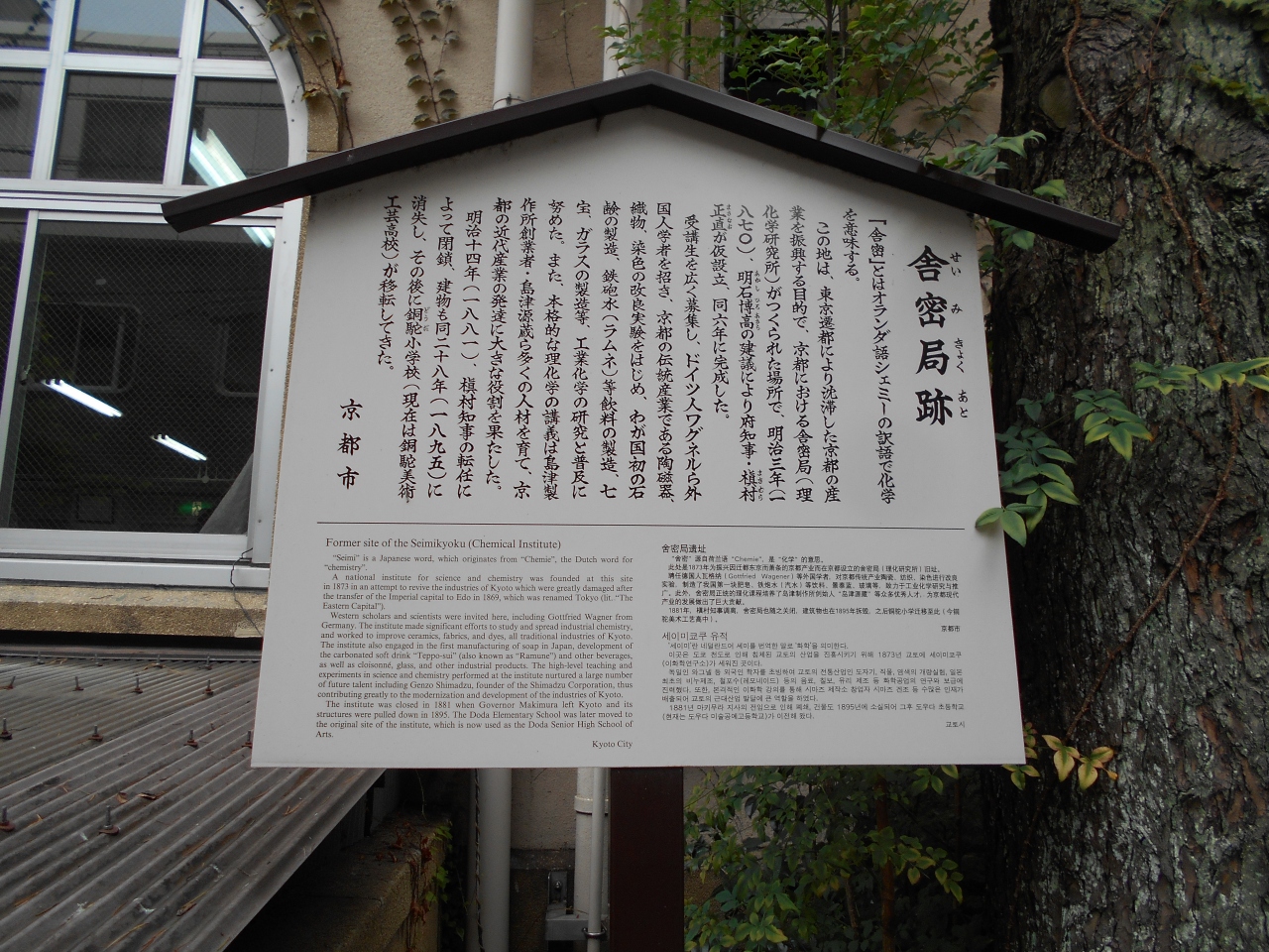 舎密局跡は、二条大橋の北西方面、鴨川近くの美術工芸高校にあります。舎密局は京都の産業を振興する目的で作られました。