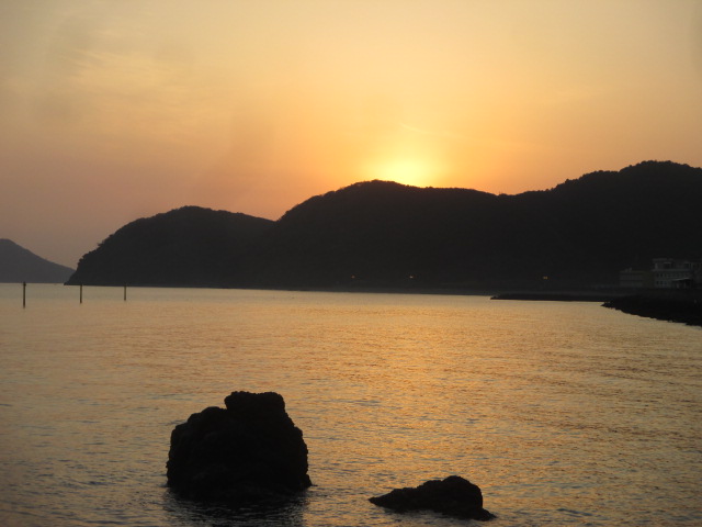 友人と夫婦岩を見に行くときに朝日も見ようということで、朝日を拝みに行きました。夫婦岩の参道は、朝日を眺める絶好のポイントです。辺りが朝焼けに染まり、美しい海岸線の山の後ろから真ん丸の朝日が昇ってきます。こんな朝日が見れるのは、二見浦ならではですね。