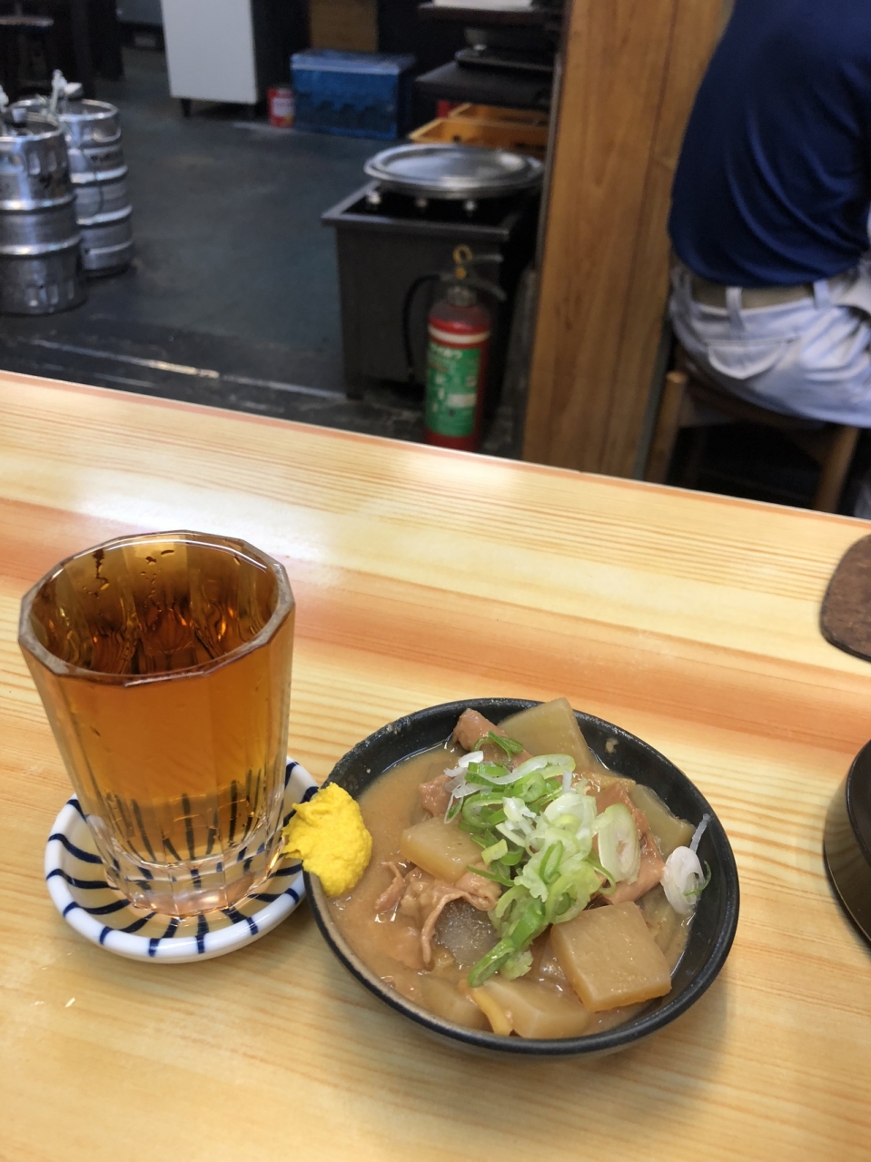 日曜日の朝10時に訪問。先客は渋い雰囲気の店内でテレビを観ながら飲んでます。名物の梅割220円、もつ煮込み170円を注文。どちらも値段から想像できないほど美味い。こんなお店が家の近くにあったらいいなぁ。