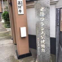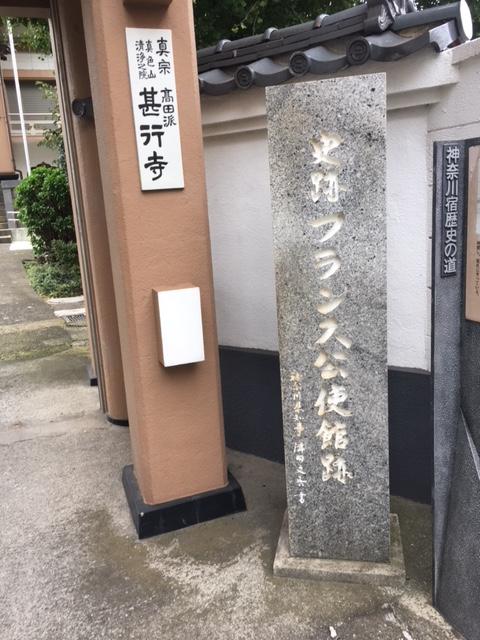 横浜駅から一駅の神奈川駅で降りて寺社巡りをしました。まずは青木橋を渡って本覚寺へ行き、また青木橋を渡って宮前商店街の方に戻りました。駅のすぐそばに甚行寺があり、その門前にフランス公使館跡の石碑が建っていました。アメリカ領事館があった本覚寺は面白いお寺でしたが、この甚行寺は今はごく普通のお寺でした。