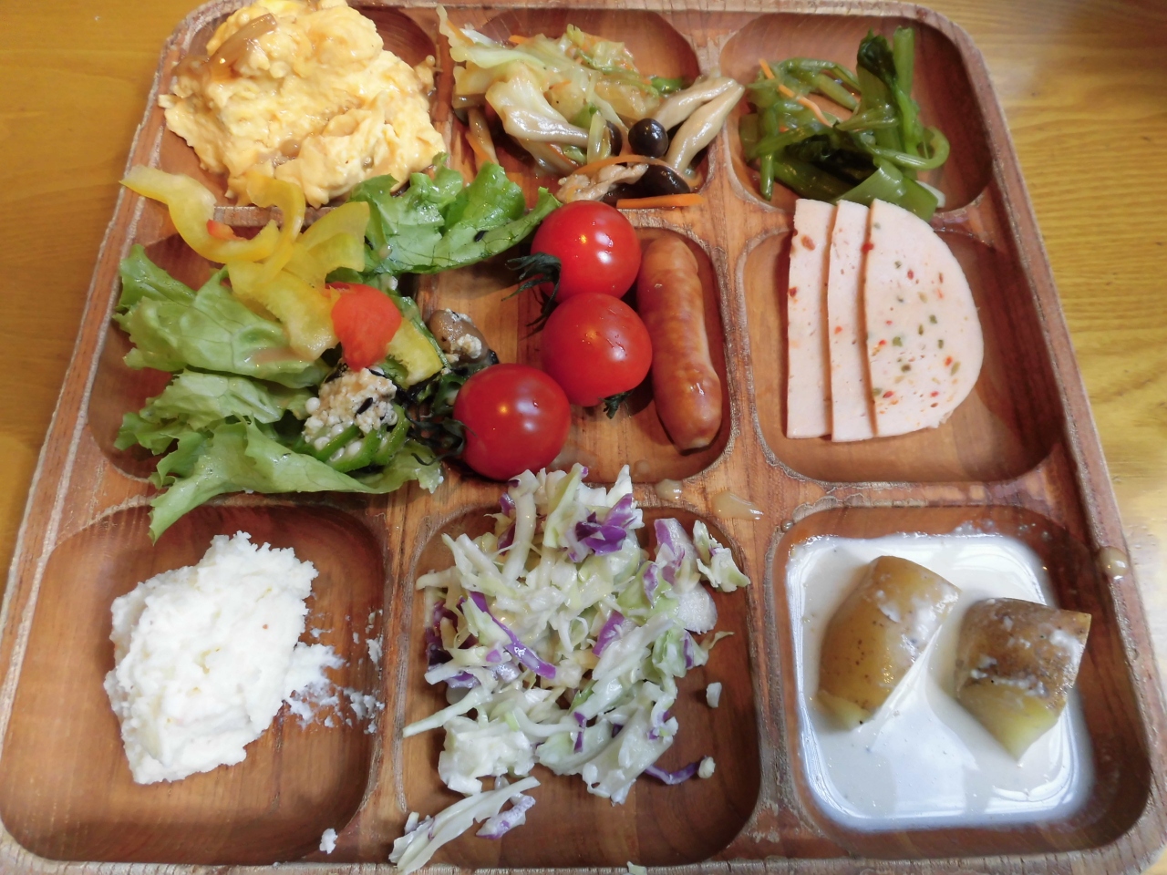 今回食べたランチのバイキングは、ハム・ウインナー数種類、野菜は生、炒め物、天ぷらなど数多くあり、スパゲティー3種類やカレーやパンも数種類、ソフトドリンクにジェラート3種類、かぼちゃプリンと少しずつ取っても全て食べきれないほどの種類がありました。ランチは90分です。