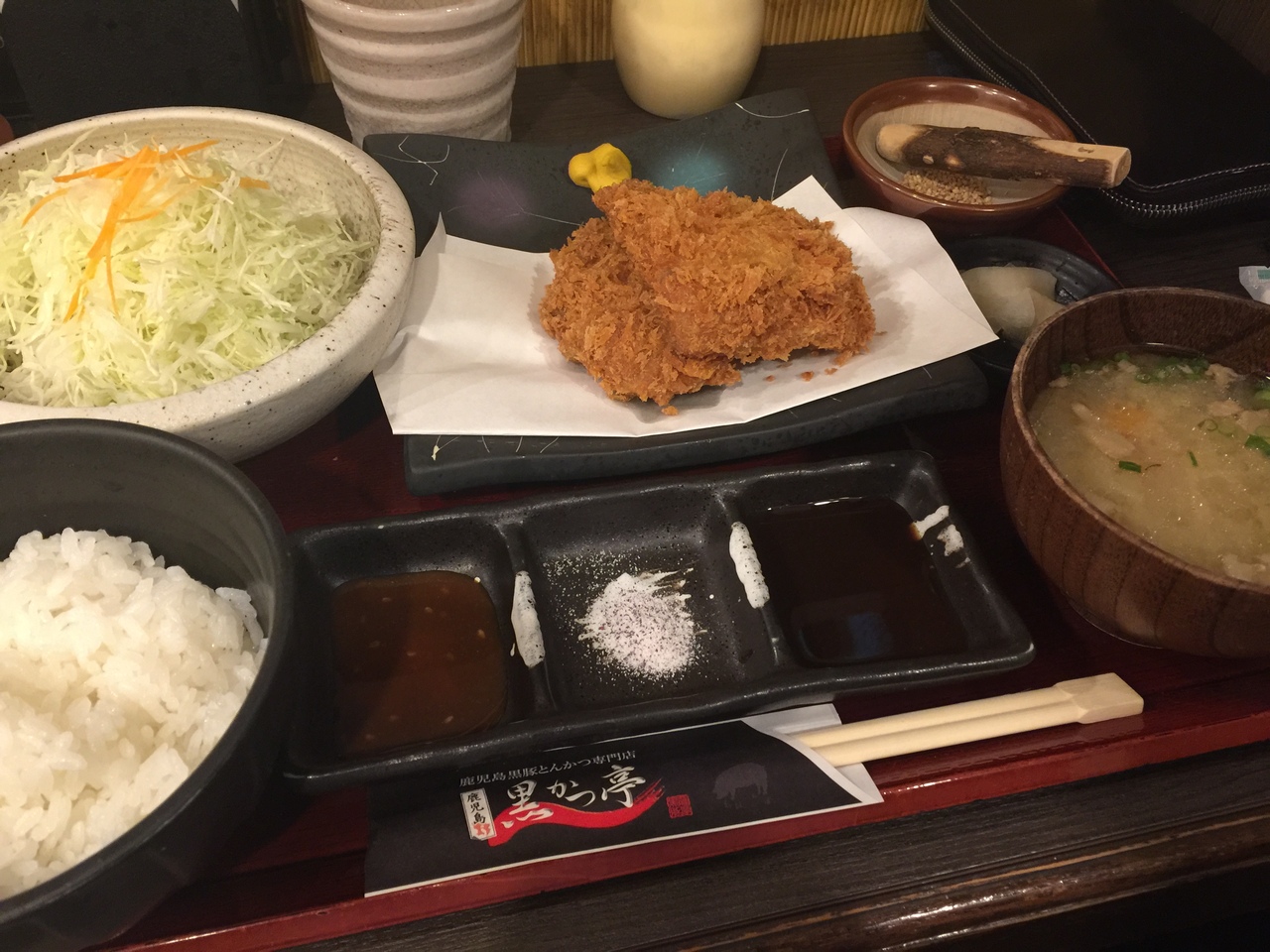 鹿児島中央駅から歩いて10分近く。ガイドブックにも掲載されているからか、13時過ぎにもかかわらず、行列が…。やや待たされたが、なんとか入店。黒かつ亭ランチ1,048円を発注。もっと待たされるかと思ったが、意外に早く出てきた。待ったかいがあった味。