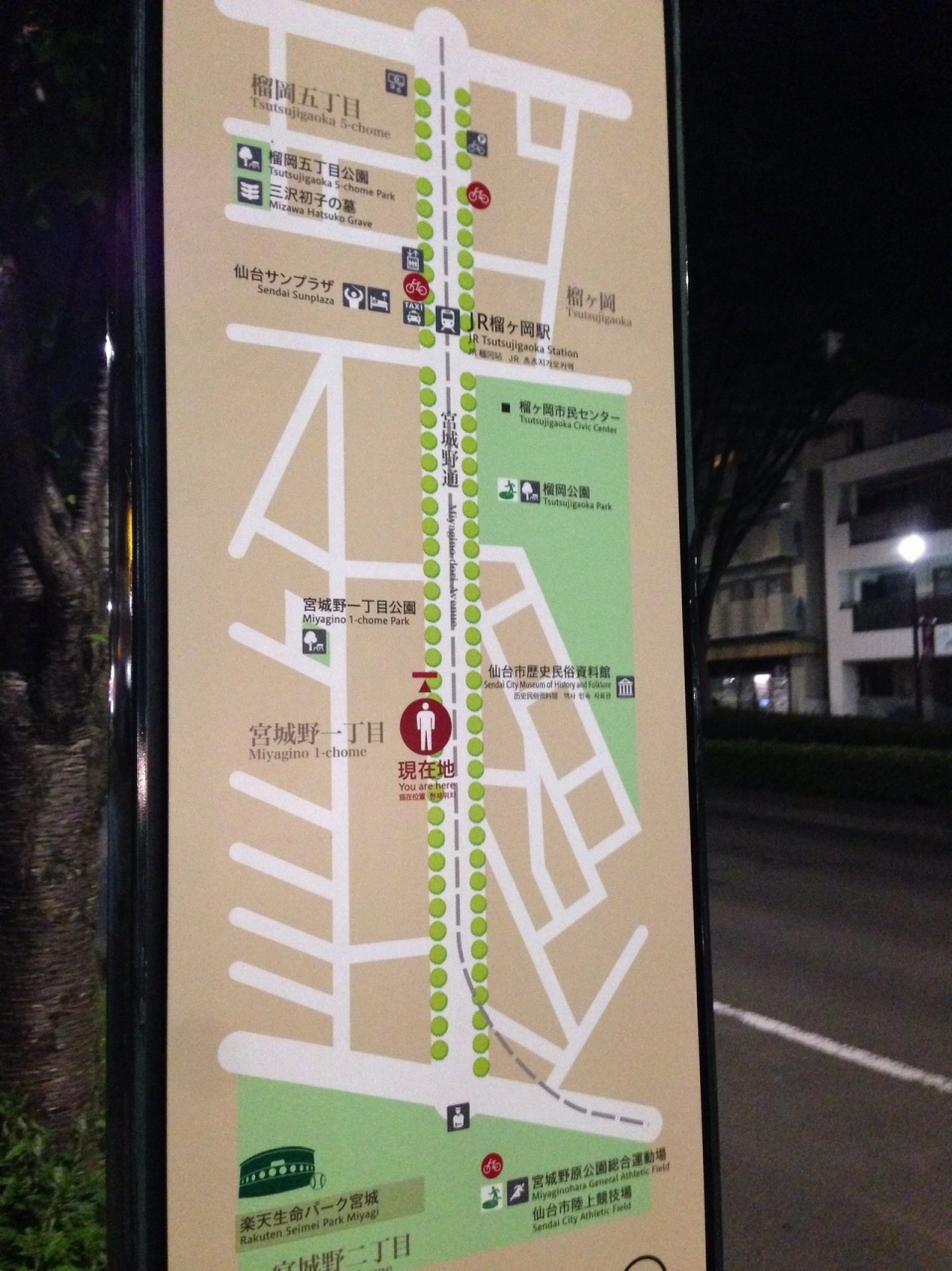 仙台駅、 koboスタ間 この道をふらふら歩いて往復しました。所々にイーグルのホームタウンである事を感じられます。20から30分程の道のりですが、まったく苦痛になりません。今回7年振りくらいに通ったのですが お店も増えたし歩道も街頭もキレイになった印象。