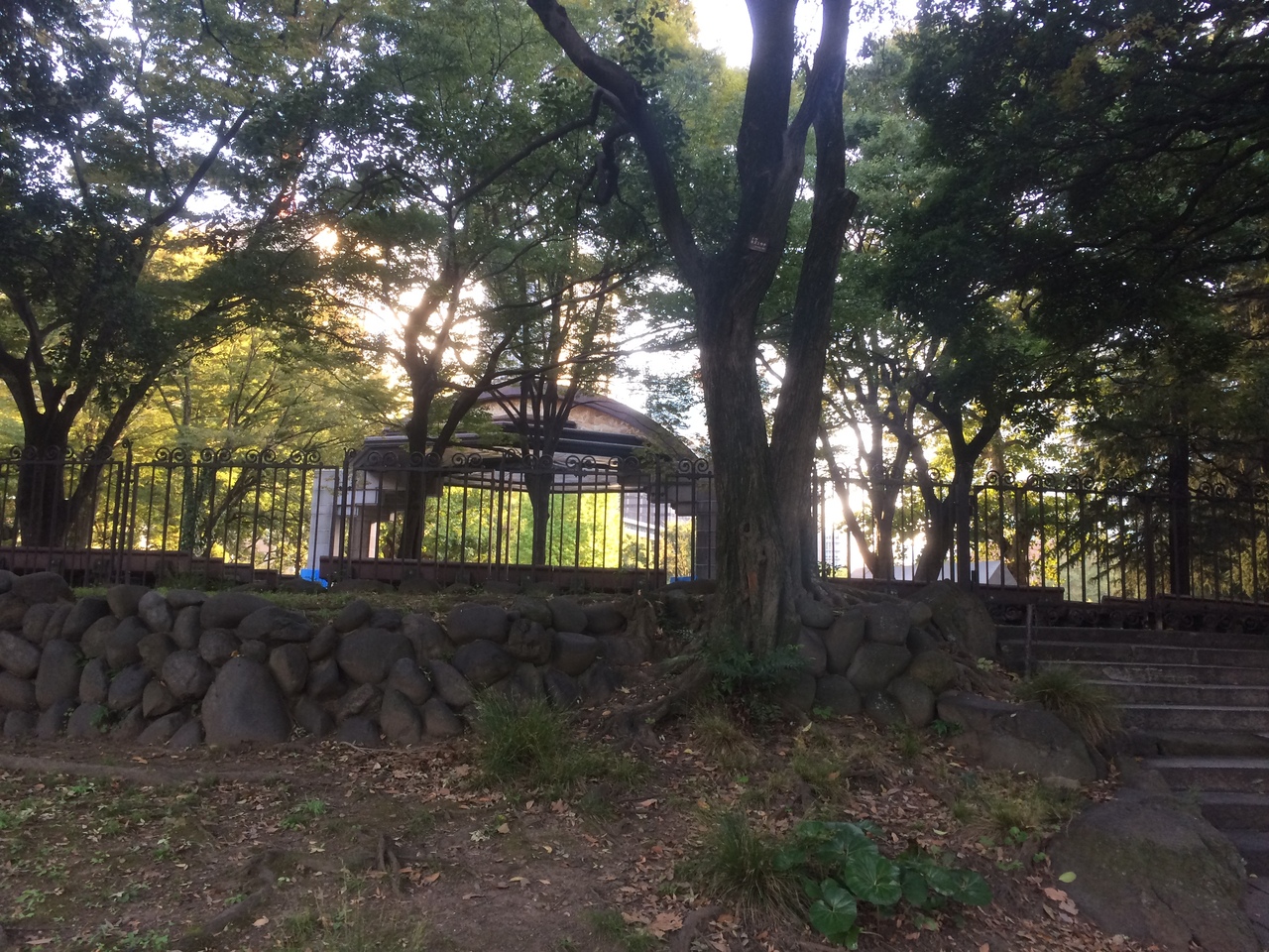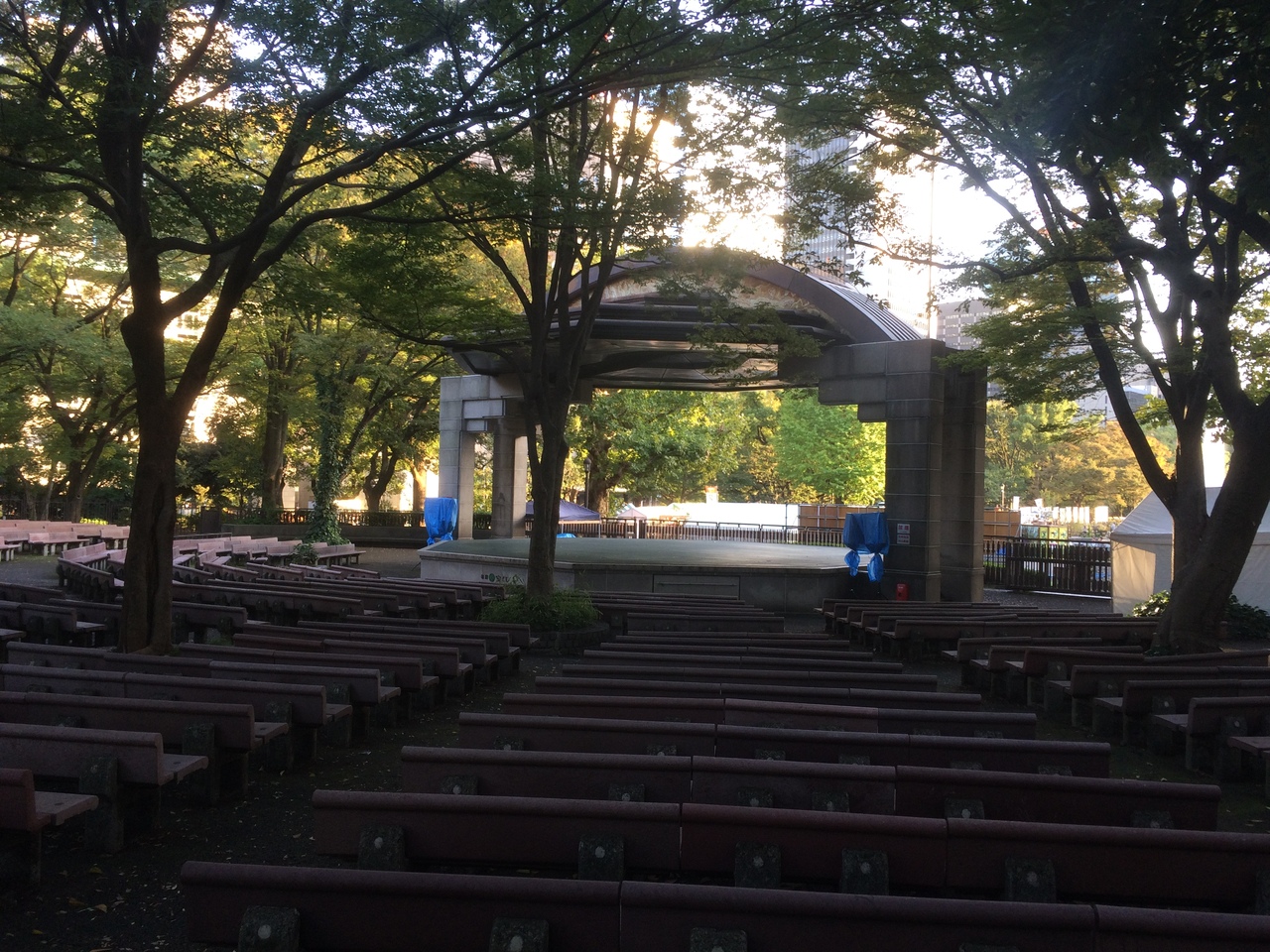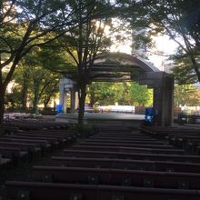 第一花壇の後ろにあり、木々に囲まれているせいか暗がりの雰囲気の場所でした。ステージがあり椅子もあり少し古ぼけていましたがポスターが貼ってあったのでまだ現役の音楽堂のようでした。座席の間にも木が生えている珍しい座席配置でした。