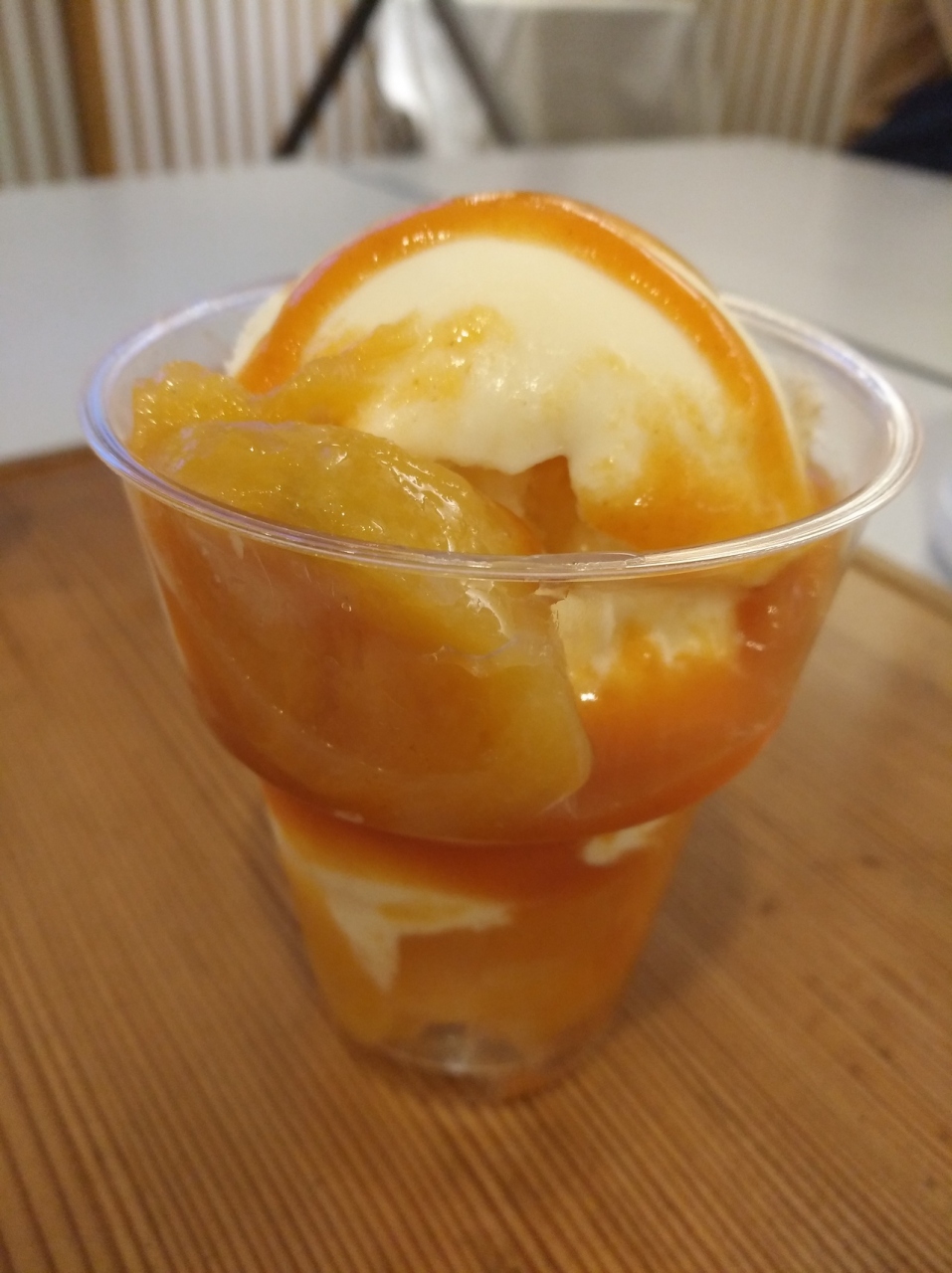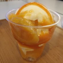 恐らく期間限定だと思いますが、店内で柿のパフェを食べることができました。バニラアイスに、たっぷりの柿の果実とソースがかかってます。果実とソースは甘さが強くなくあっさりとした味でした。バニラアイスの方が甘かったかな…。超絶品とまではいかないですが、秋を感じることが出きるので、食べてみる価値はあると思います。
