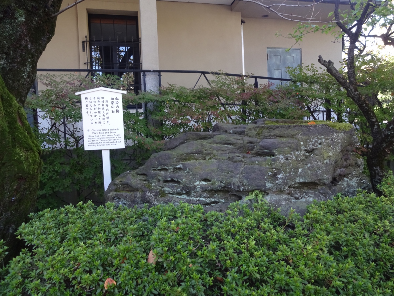 浅野内匠頭が田村右京太夫邸で切腹した時にその血がかかった大きな石と梅の木が残され移設、泉岳寺の境内に保存、展示されていました。