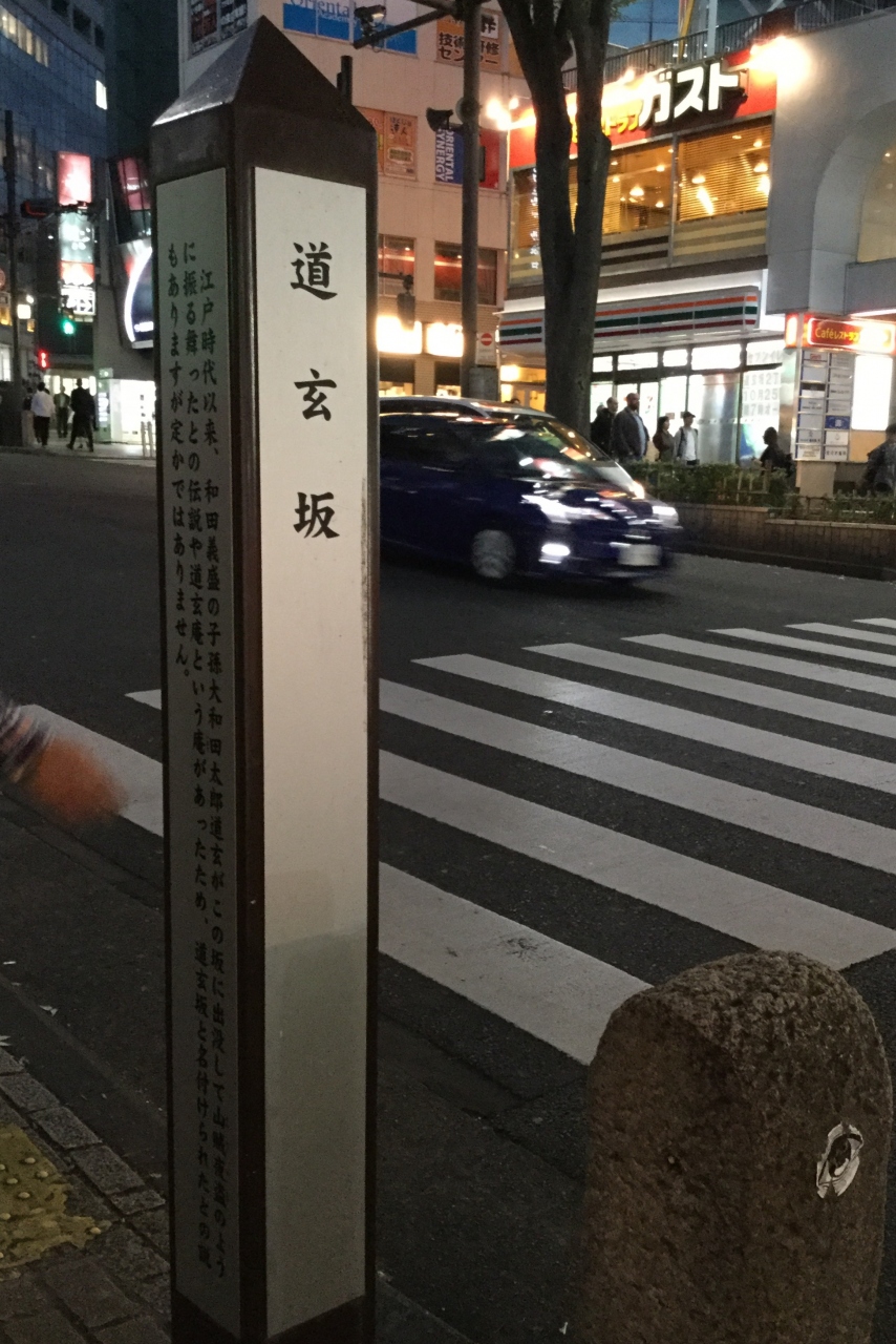 渋谷にある、駅から西の方へ上る坂のひとつ。結構長く勾配がありますが、多くの人が行き来して、いつも混んでいます。「道玄」とは「大和田太郎道玄」という人の名前だったようで、坂の上には由来がわかる碑がありました。でも、そこで足をとめる人は少ないように思います。