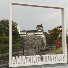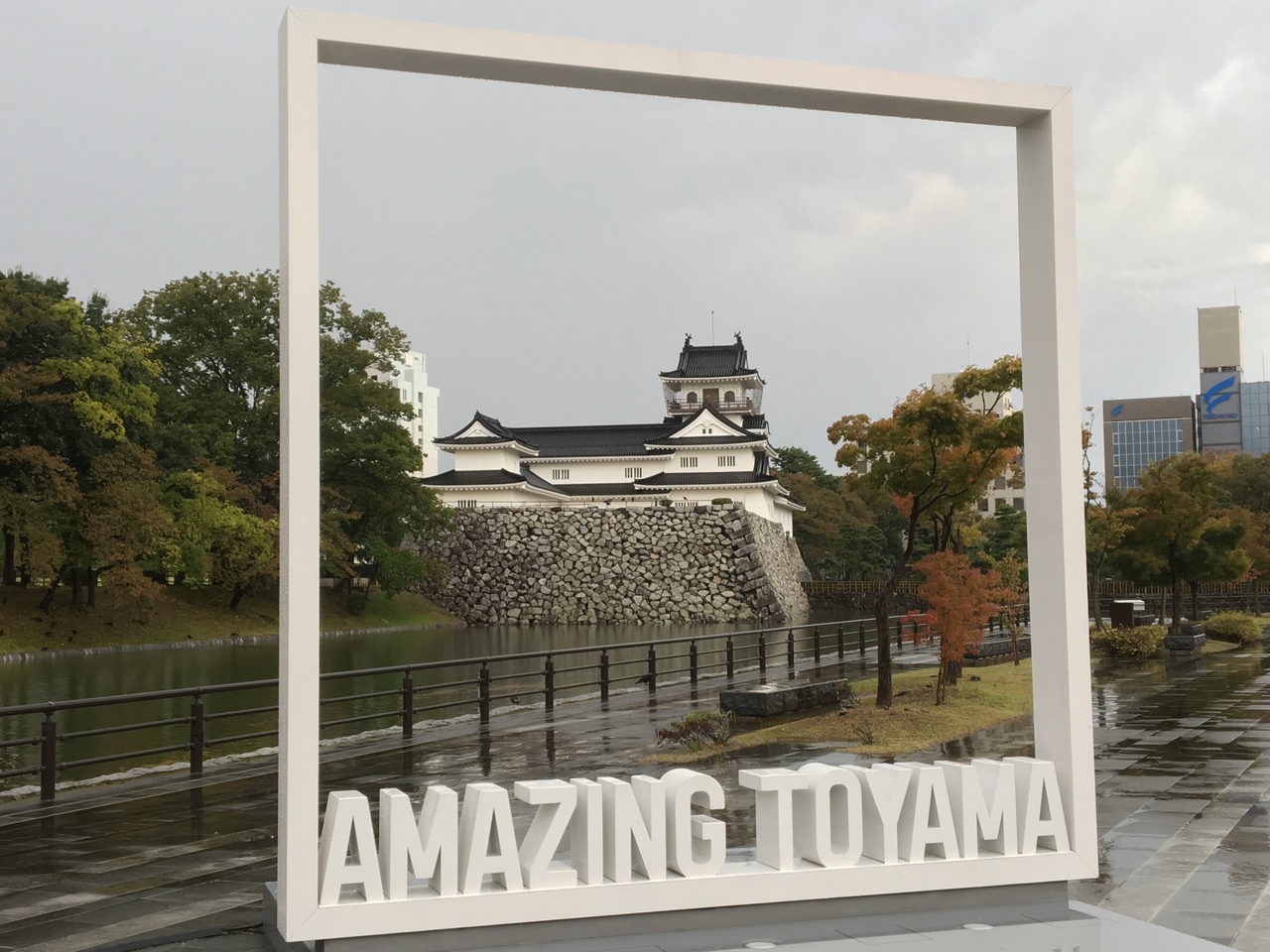 富山駅の南側のお堀を隔てた歩道沿いに、AMAZING TOYAMAと描かれた白い額縁がありました。南側からのぞくと、額縁に富山駅が入るように作られていました。なかなかしゃれた感じで、ぜひ額縁越しの富山城をオススメします。