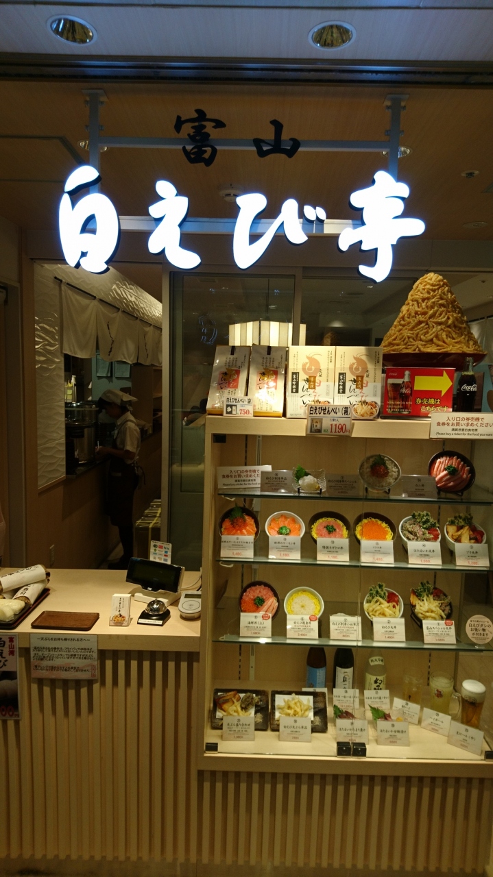 店舗入口には、山のように積み上げられた、白エビ天丼のディスプレイされた食品サンプルがとてもインパクトがあり、メニューの中から白エビ天丼を選び食べました。