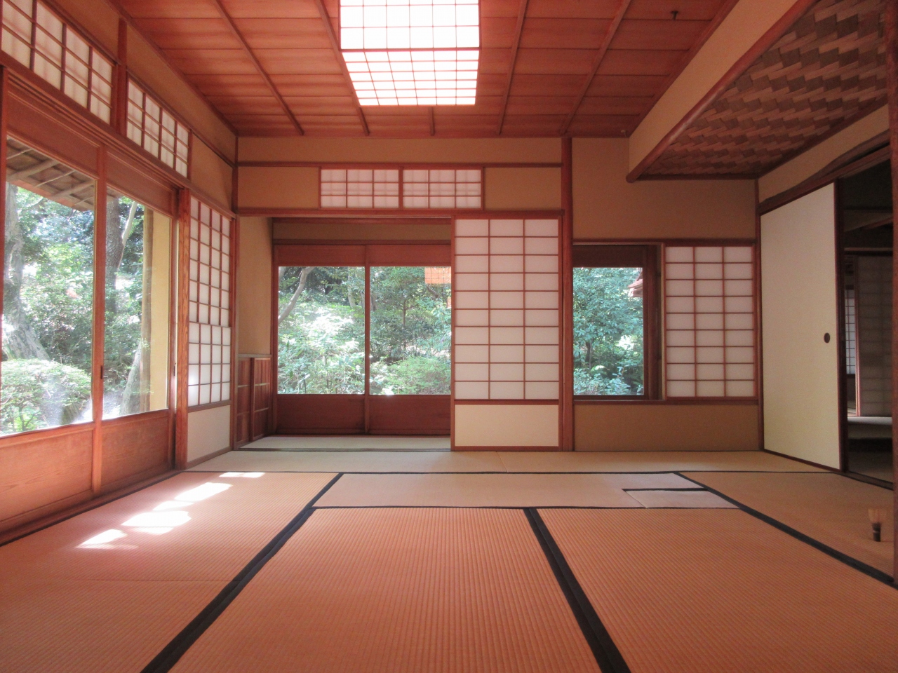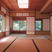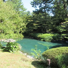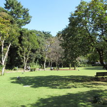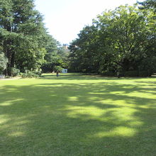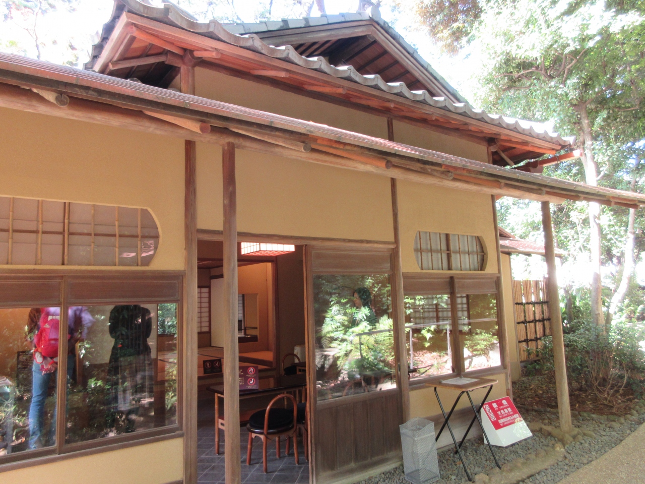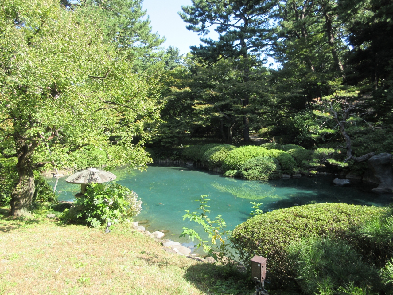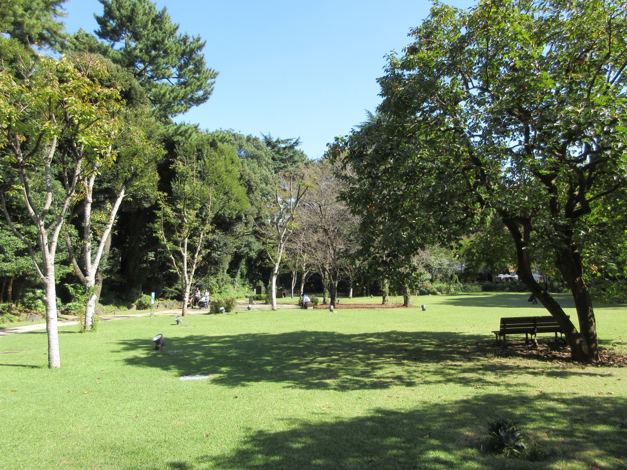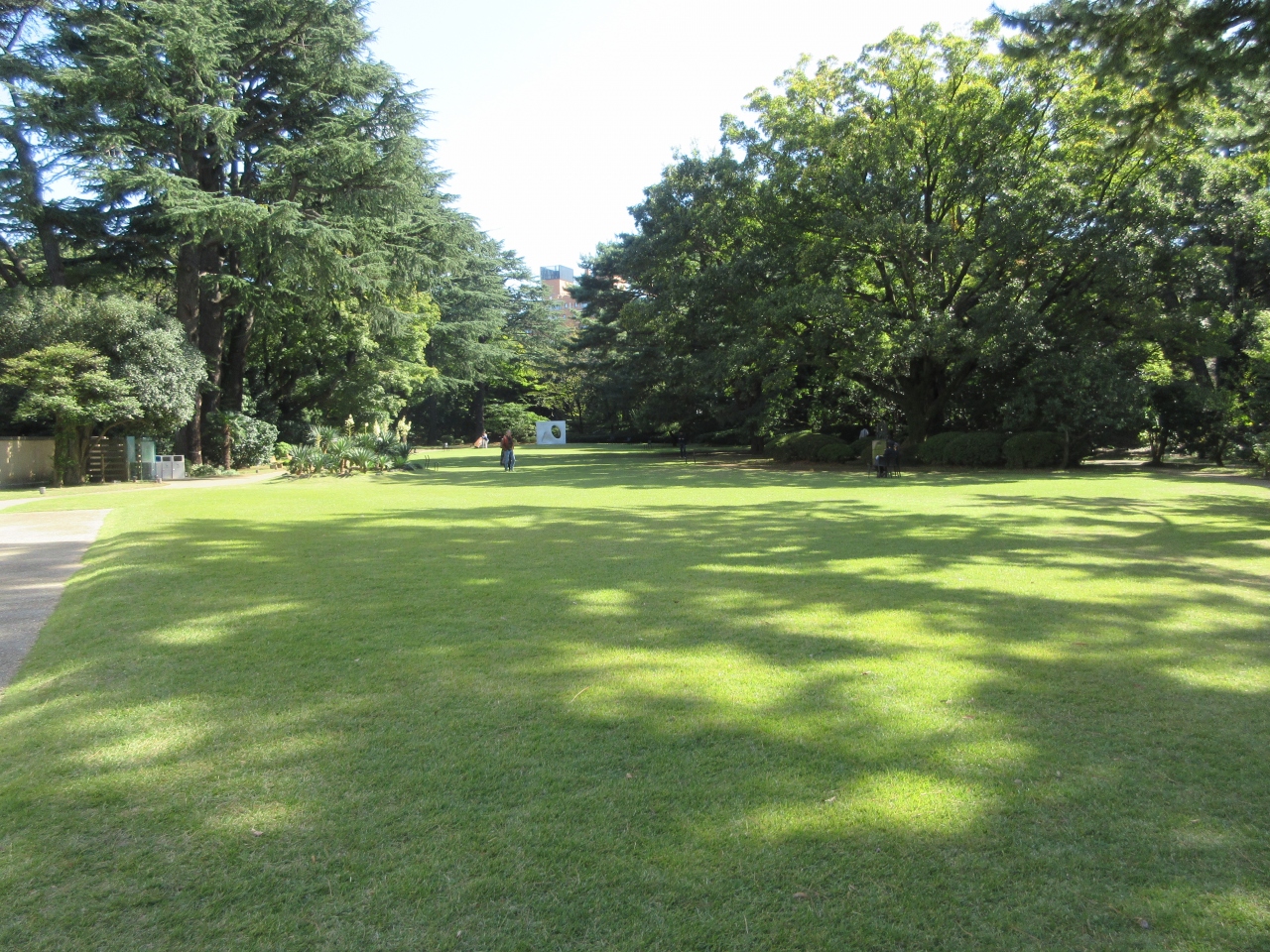 目黒駅から徒歩7分ほどの目黒通りに面した東京都庭園美術館の庭園です。美術館脇の入口を通ると広い芝生があります。奥に日本庭園と茶室があり、茶室の立礼席から広間を見ることができます。茶室の前の池に大きな鯉が泳いでいました。池はコンクリートの底のようで青い水が人工的で日本庭園に不釣り合いな色でした。道路脇の西洋庭園は芝生の中央に色づき始めた柿が2本生えていました。パラソルとテーブルとイスがあり明るい気持ちの良い場所でした。手入れされている芝生に日が当たり気持ちいい庭園です。弁当を持ってきてパラソルの下やベンチで食べるのもいいでしょう。難点は目黒通りや首都高2号線を通る車の騒音が絶えずすることです。素晴らしい庭園なのに気になりました。