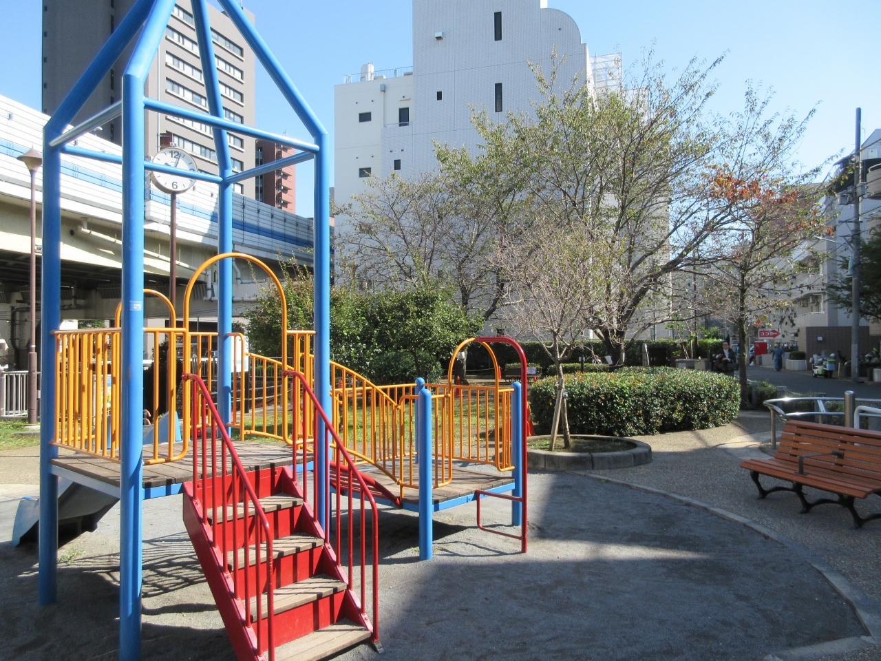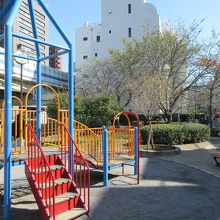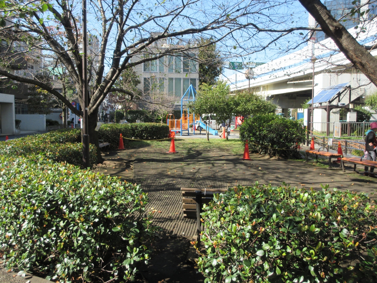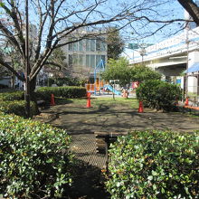 明治通り沿いの古川に面した小さな公園です。芝生養生中でロープが張ってある箇所がありました。幼児用すべり台や非常用かまどベンチが設置されています。古川沿いの親水テラスは階段がベンチのようになっていて浄化された古川を眺められます。秋晴れに訪れたので川に日が当たり、川底から湧く水が水紋を造り向かいの岸壁に映っていました。岸壁の動きある水紋は芸術的で美しく川面に日が当たる時に見てはいかがでしょうか。ぼーっと眺めて癒されました。