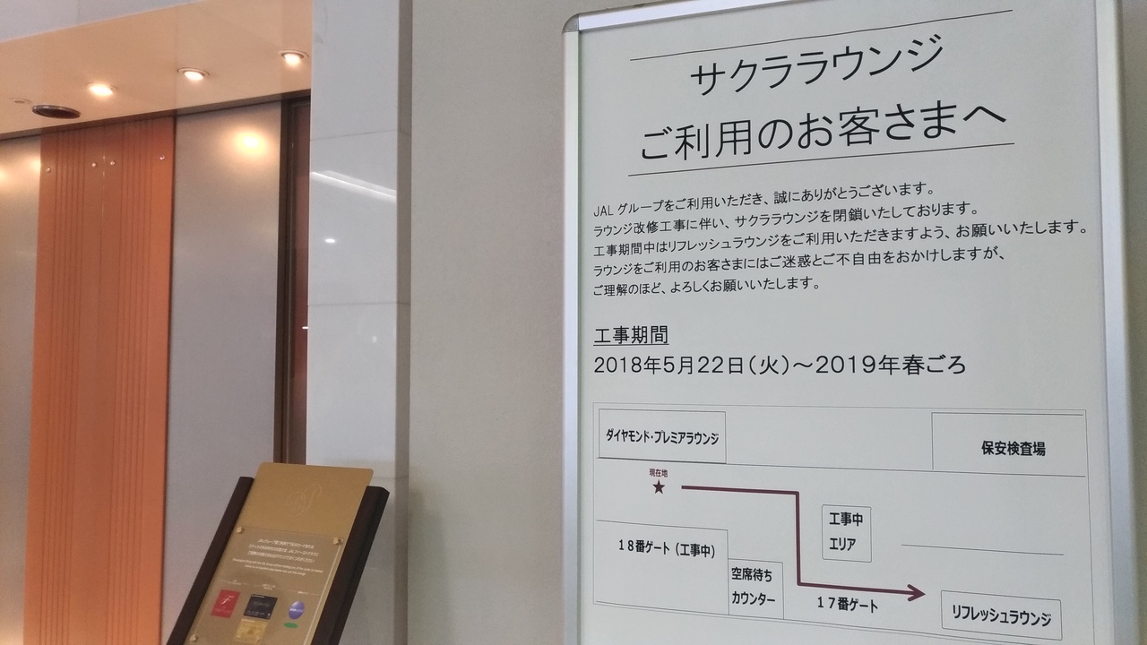 サクララウンジが工事中のため、仮設ラウンジにて営業中でした。仮設のため、温かいドリンクの提供はなく、缶ビールやパックジュースのみが提供されていました。通路を植木鉢で仕切って、目隠しにし、椅子を置いただけのラウンジなので、あまり居心地は良くなかったですが、仮設でも用意してもらえありがたいです。