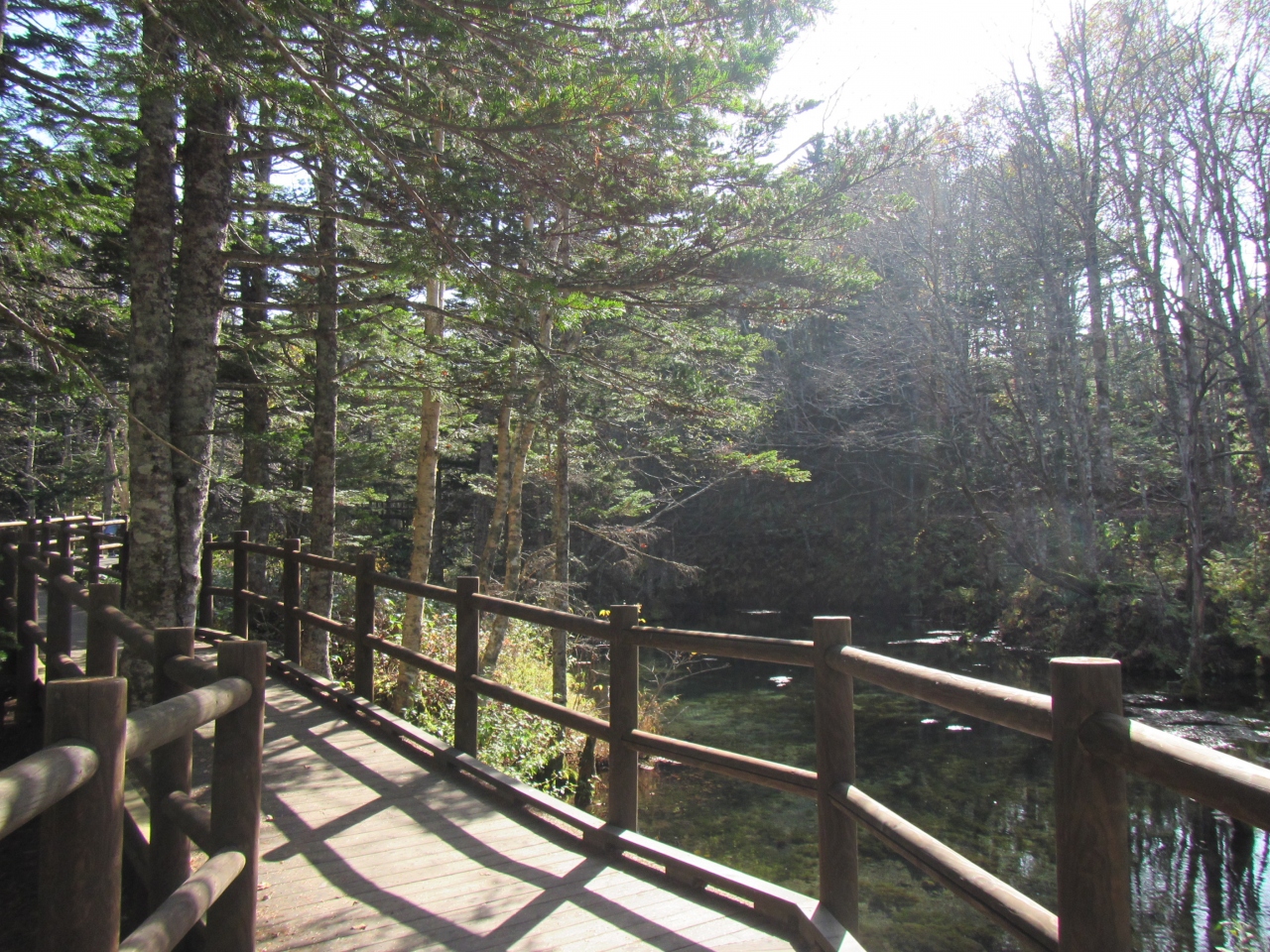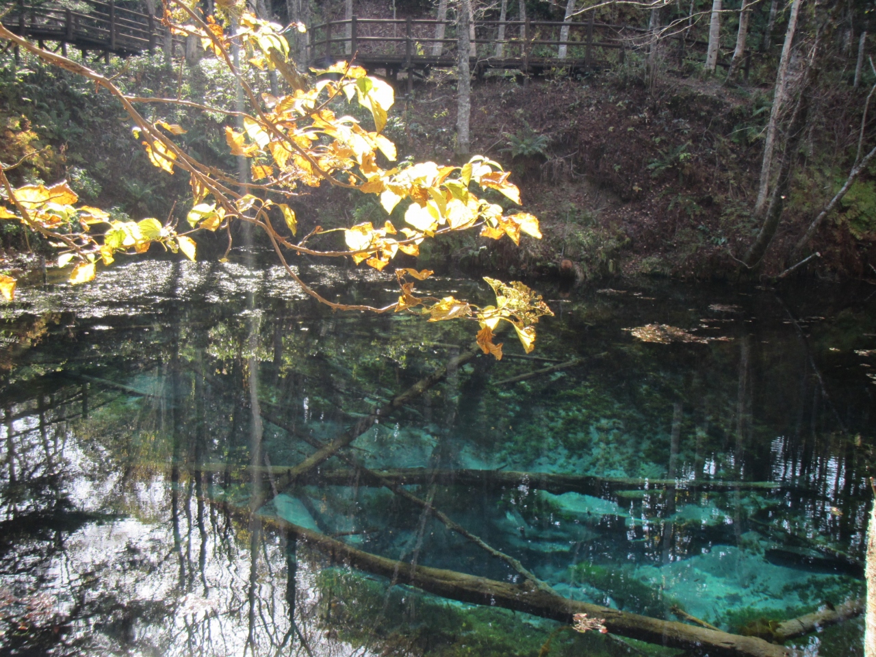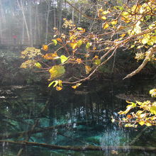 10月中旬、色づく木の葉と青い池のコントラストを楽しめましたが、紅葉のきれいな木は池の回りには少なく、また、既に葉を落としている木も目立ちました。