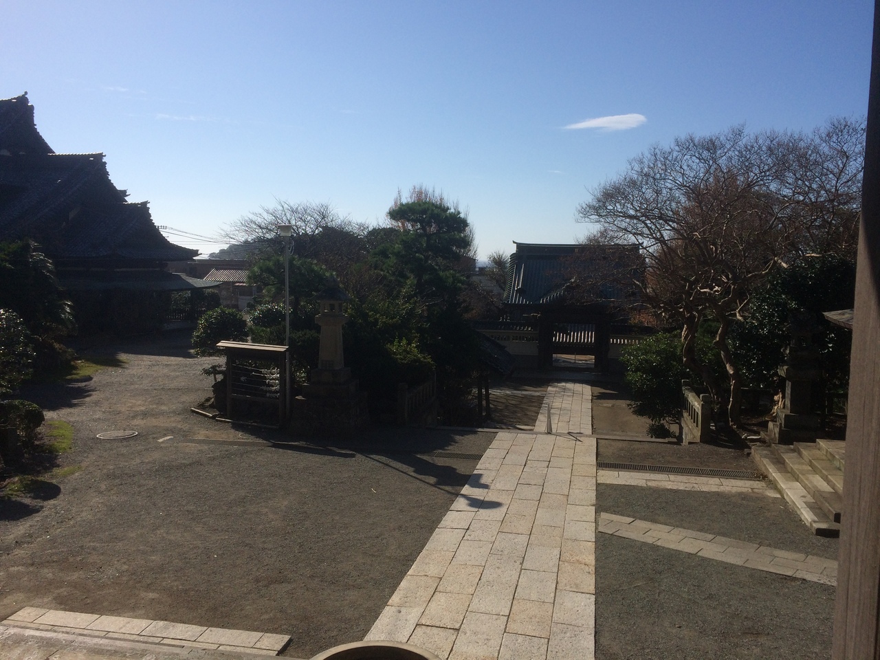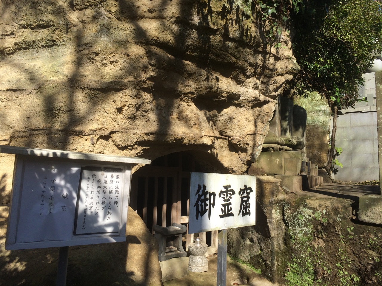 江の島電鉄線路沿いにあったので訪問しました。意外と大きな境内で右側の鐘は鳴らすことが出来、良い鐘の音でした。山門の仁王像は睨みつけていて眉毛が濃かったです。御玲窟と言う岩をくり貫いた場所があり、幕府に捉えられた日蓮上人が一晩幽閉されたという洞窟があります。本堂にも入る事が出来、屋根が薄いエメラルドグリーンでした。