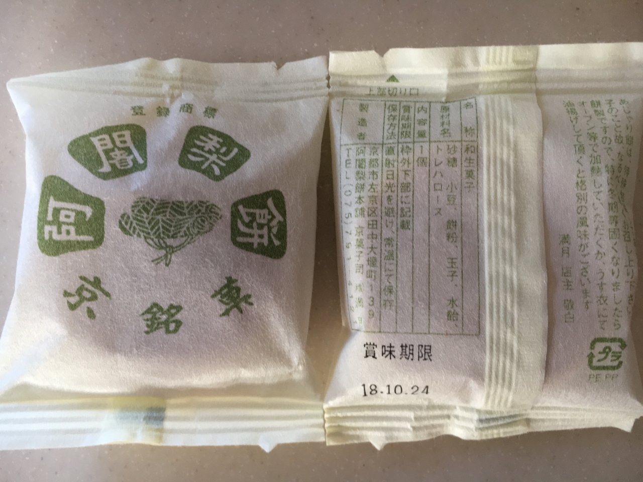 普通の餅でもなく、まんじゅうでもない、もっちり感が美味しい阿闍梨餅。個包装になっているので、手土産やお使い物にとても喜ばれます。 帰省のお土産として購入しました。こちらお店は、他の京土産のお菓子も購入できるのでとても便利です。