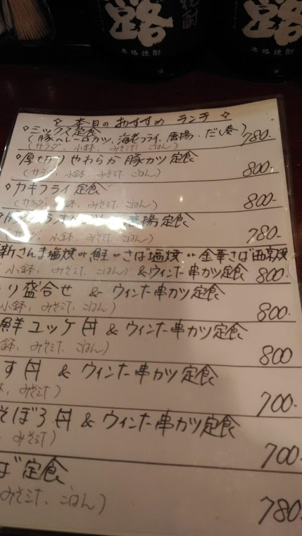 ランチは、居酒屋の定番の各種ランチですが、ここは10種類以上もあるのでびっくり、基本は揚げ物系と焼き魚系、丼系に分かれ、揚げ物系には出汁巻がついたり、焼き魚や丼にもから揚げがついたりとボリュームあります。これだけ種類が多いと時間がかかるかと思って、定番の日替わり(ヒレカツ+エビフライ+から揚げ+出汁巻)を頼んでみると、注文を受けてすぐ具材をフライヤーに投入、揚げたてのカツ、フライがいただけました。揚げ物の具材の組み合わせなのでどれを頼んでもスピーディーにこなし、いいですね。