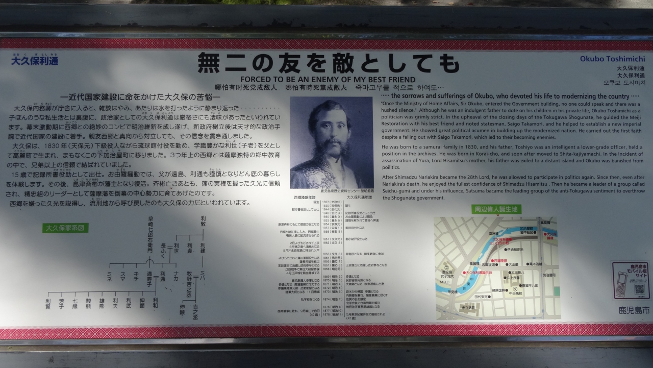 石碑は非常に古く、文字も読みづらくなっていますが、それもそのはず明治22年に建立されたたとのこと。賊軍の頭だった西郷さんが賊名を解かれた後、大山巌たちが敷地を買い取って、西郷さんの誕生の地と同時に整備したとのこと。その際、記念碑や碑文は全く同等に扱い、同種同数の樹木を植えることなど、完全に平等に扱う配慮を行ったとのことです。後世、大久保さんは鹿児島の敵的な扱いを受けますが、実際に、彼らと付き合いのあった明治維新の偉人達にとっては、そうではなかったということが垣間見れますね。この辺りで青年期を過ごした時期が、彼らにとって一番楽しかったのかなと思いを巡らしながら散策しました。
