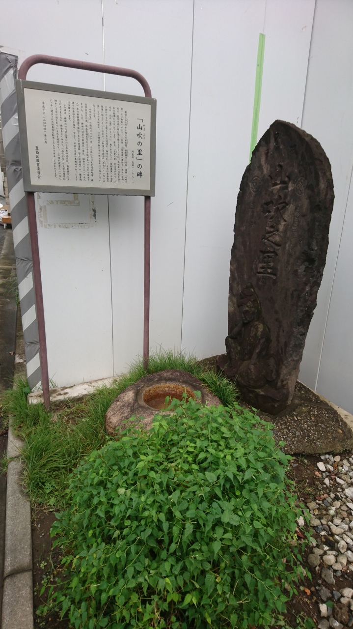 面影橋の北詰に「山吹の里」伝説の石碑がありました。この伝説は、太田道灌が鷹狩りの際にこの地を訪れた際、にわか雨に遭って近くの農家の娘に蓑を借りようとしたところ、山吹の花を差し出してきた時の話です。道灌は何のことかわかりませんでしたが、後拾遺和歌集の歌にかけて蓑のないことを伝えようとしたのでした。その後、道灌は和歌を学んだと言われており、まるで歴史の一頁を見るようでした。