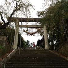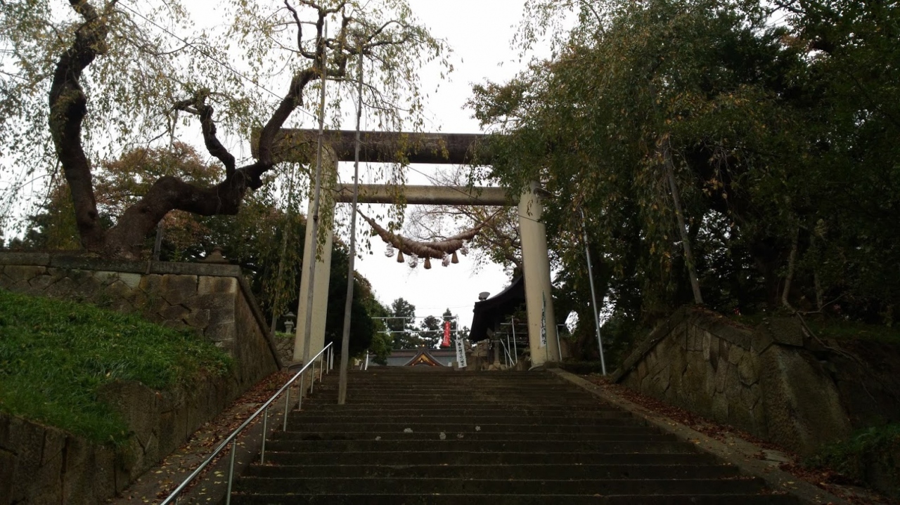 烏帽子山公園にある神社で、温泉街から石段を登って上がります。神社から温泉街が一望できます。鳥居が一本の石でできていてその大きさは日本一だそうです。地震でも倒れず今日まできているのはすごいものです。神社は大きく、結婚式場もあり地元の人に大事にされています。