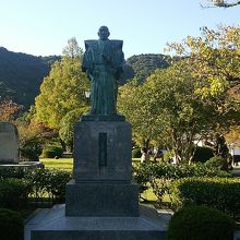 岩国藩主吉川広嘉公の像で、錦帯橋を渡りきった、吉川公園の入り口、岩国中学・高校跡地のすぐ横にあります。
