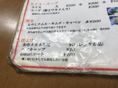 店内に入るとすでに煙で真っ白、水中眼鏡やゴーグルなどが置いてあり煙が気になる方は装着がおすすめです。