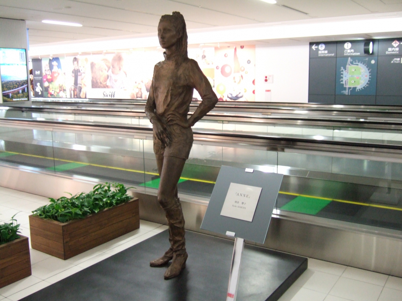 新千歳空港の国内線ターミナルビルから国際線ターミナルビルに向かう2階の通路には、動く歩道の両側にブロンズ像が並んでいます。国内線近くの裸婦ばかりが目立っている感じがしましたが、よく見ると洋服を着ている像もありました。