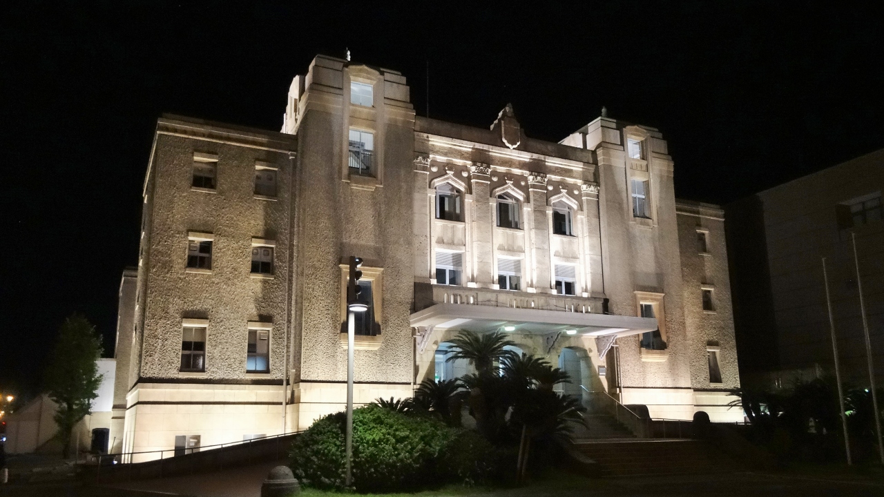 西郷銅像の撮影スポットが、この建物の前ですので、鹿児島に来た人は、一度は目にしているかもしれませんね。夜は」建物をライトアップしていました。
