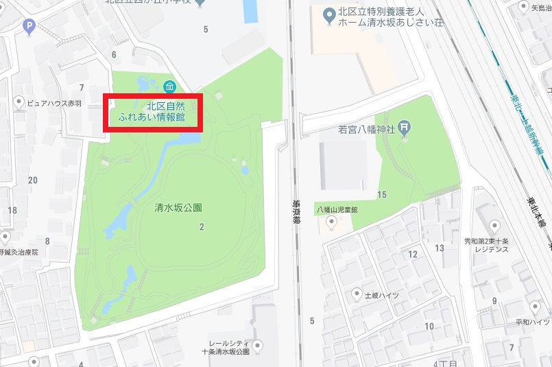 自然ふれあい情報館は、赤羽駅の南側の清水坂公園の北端地区にあります。