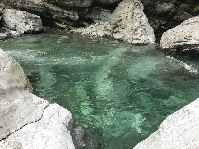 とても美しい渓谷です。薄いエメラルドグリーンの水の底が透けている。すごく綺麗な水だけど、生き物の気配がしなかったです。水の中にも、岩山にも。なぜでしょうかね。岩山を上りつつ、ダムの方へ歩ったらセリ割洞窟があって、行き止まりになっていました。セリ割洞窟が転換ポイントです。