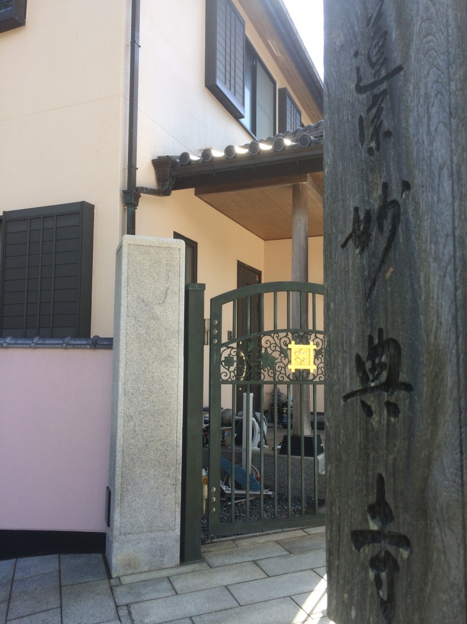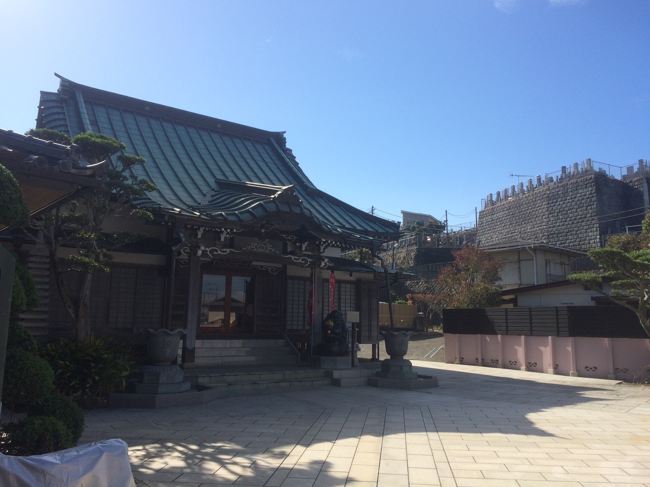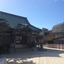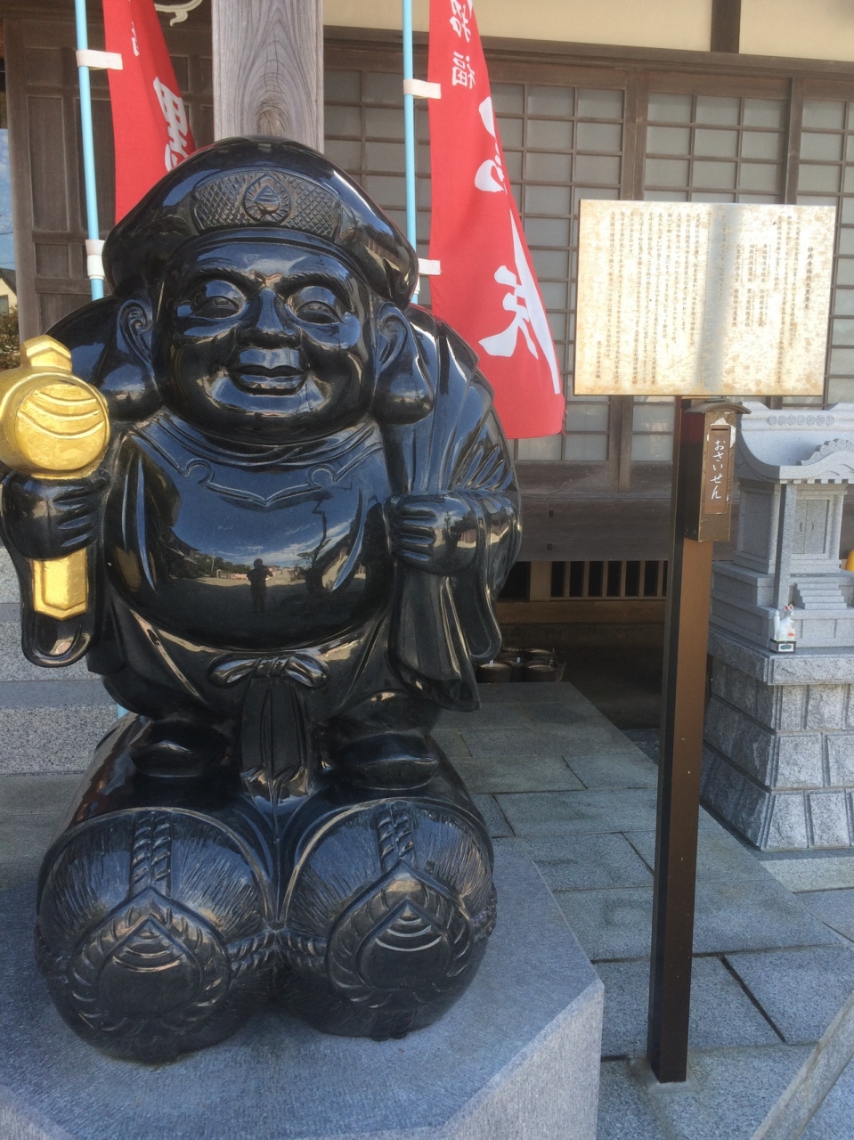 ほんの少しの緩やかな坂を上がると境内で、左側が本堂で、住居と繋がっているような感じでした。綺麗な境内で、本堂の前には黒い大黒尊天があり、後ろには赤い幟が二本立っていました。横には説明看板がありましたが、大黒尊天以外は見どころがないです。