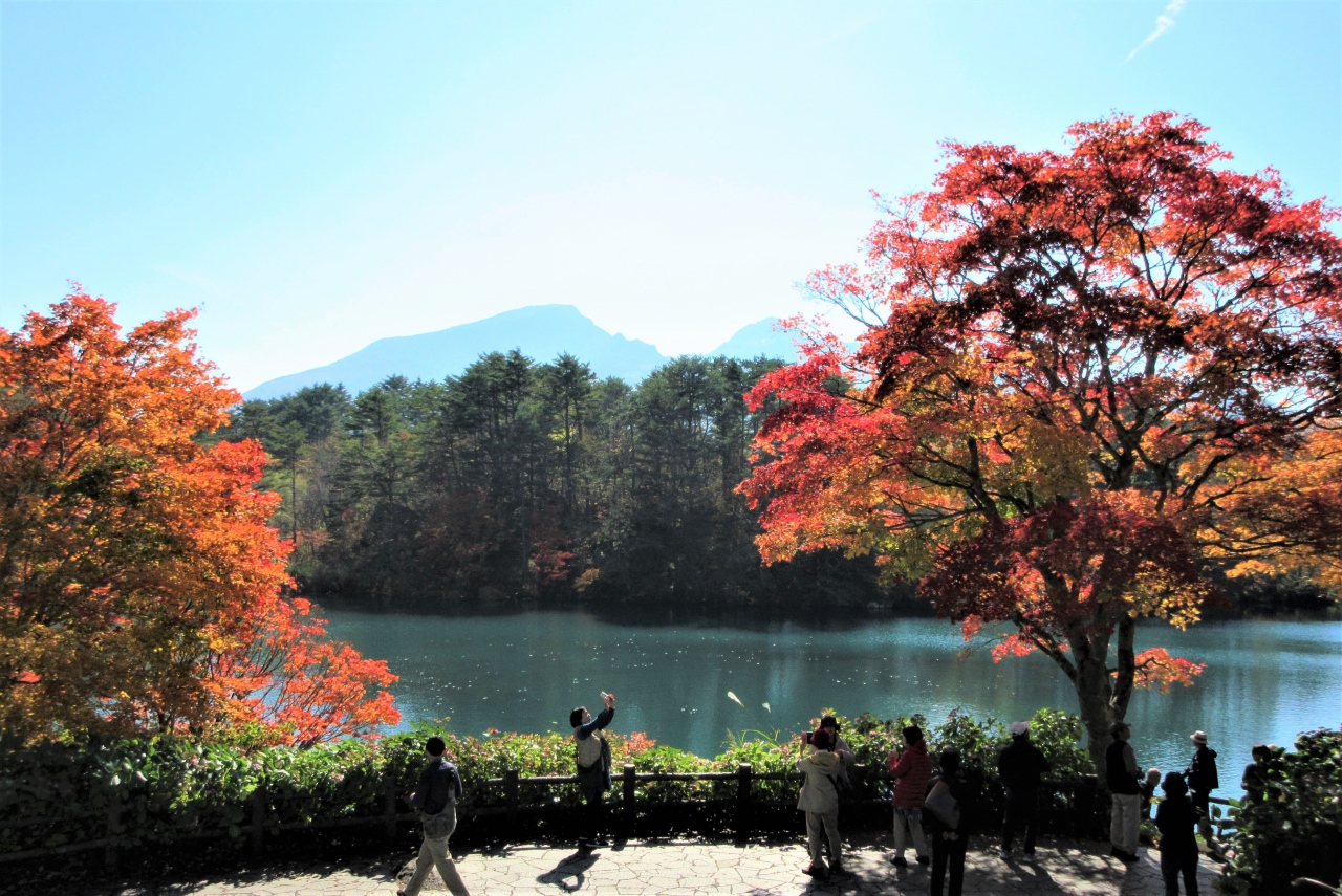 毘沙門沼の展望台は紅葉がきれいでした。正面に会津磐梯山が見えます。
