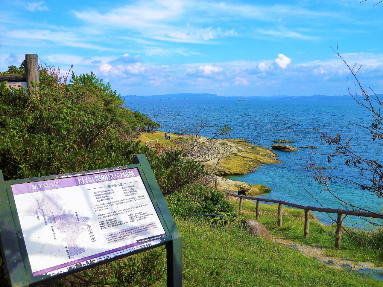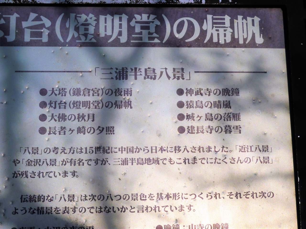 浦賀水道(東京湾)を守り続ける灯台は和式灯台[燈明堂]から洋式灯台(観音埼灯台)に(口コミ;2015-03)。 実は`三浦半島八景`で<灯台(燈明堂)の帰帆>を見付けて再度来ました。景観は変わってないですが、入口の立札にちゃんと案内図`三浦半島八景`は覚えてないのですが,,案内図は新品,,(^^?) でも、久しぶりに燈明堂位置から湾を見ると手前に浦賀湾/観音埼が そして対岸には房総半島が,,懐かしいです!
