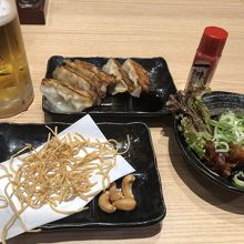 おつまみセットには、生ビールと餃子、もつ煮込みとおつまみがでてきました。