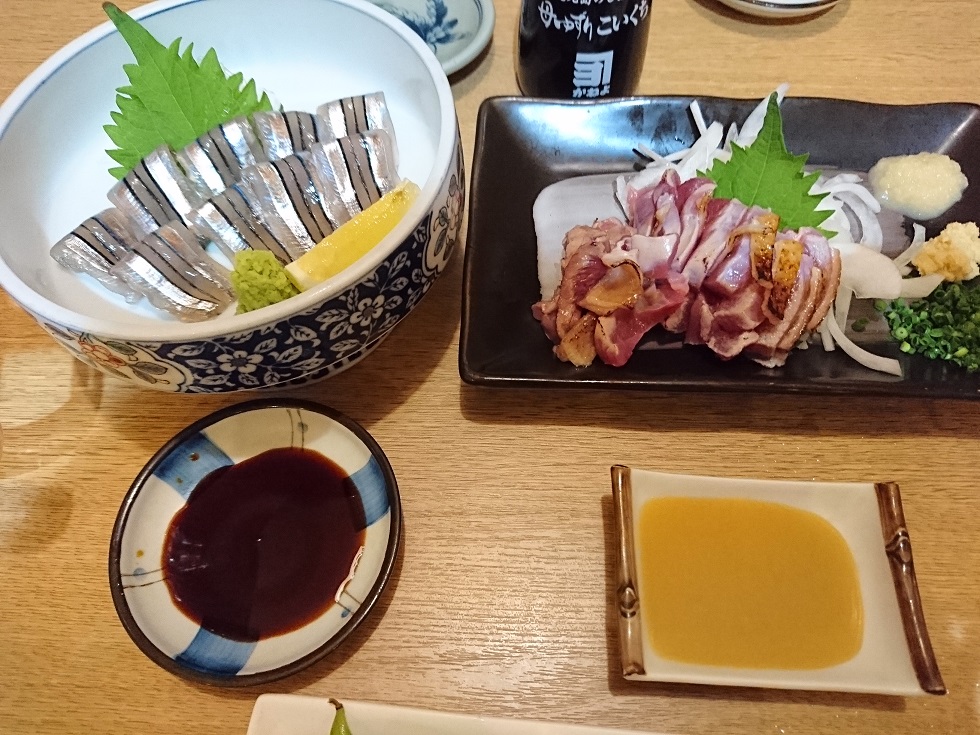 鹿児島の郷土料理を求めて探した居酒屋、キビナゴの刺身、さつま地鶏の刺身、黒豚とんこつなど郷土料理満載のメニューでした。どれも美味しくいただきました。つまみと一緒に味わうお酒、芋焼酎と一緒に美味しくいただきました。