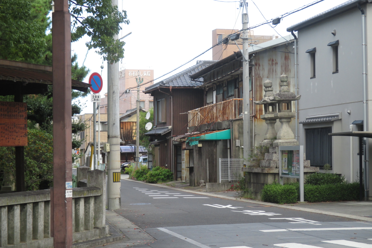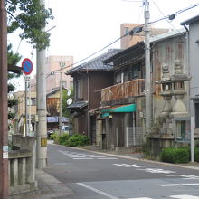金比羅参りのメインルートだったといわれる、昔の丸亀街道は現在の高燈籠の東側のところへ通じていたそうです。交差点に行って、その道をみると、今では他の道と比べても細い道で、路地と呼んでもおかしくない感じです。いろいろな変遷がありますから今の状況と違うとは思いますが、往時はメインルートでもそれほどの道幅はなかったのでしょう。