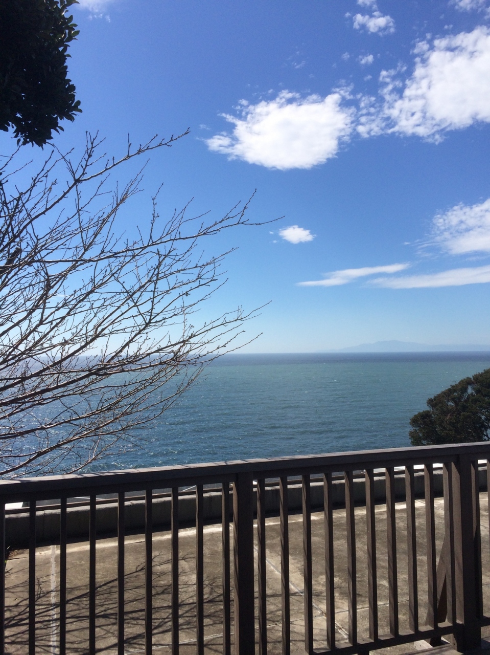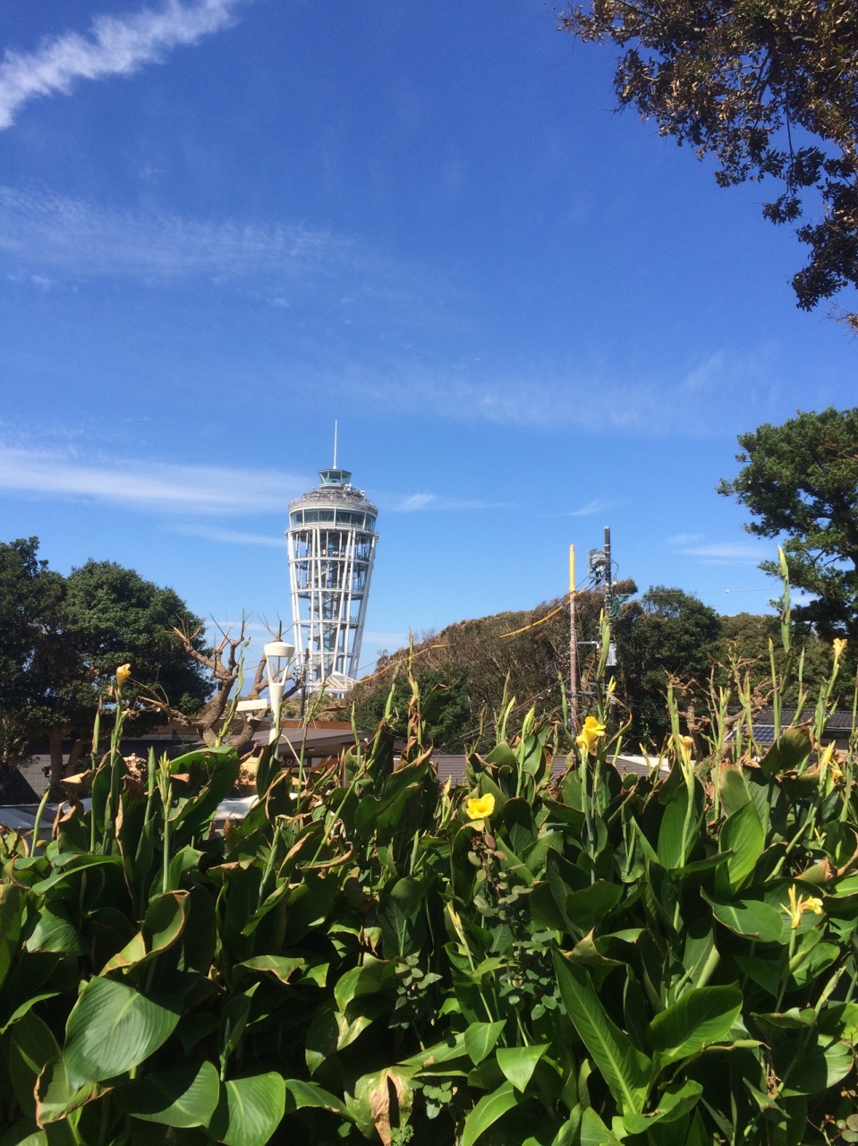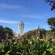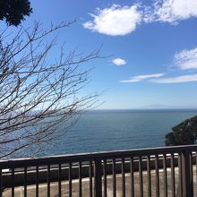 遊歩道沿いの横の少しの階段を登ると長方形型の場所にありました。江の島の高い位置にあるため、海が見渡せ遠く鎌倉の方も見えました。後ろを振り向いたら江の島展望灯台が迫力がる高さで建っていました。広場は柵で囲ってあります。