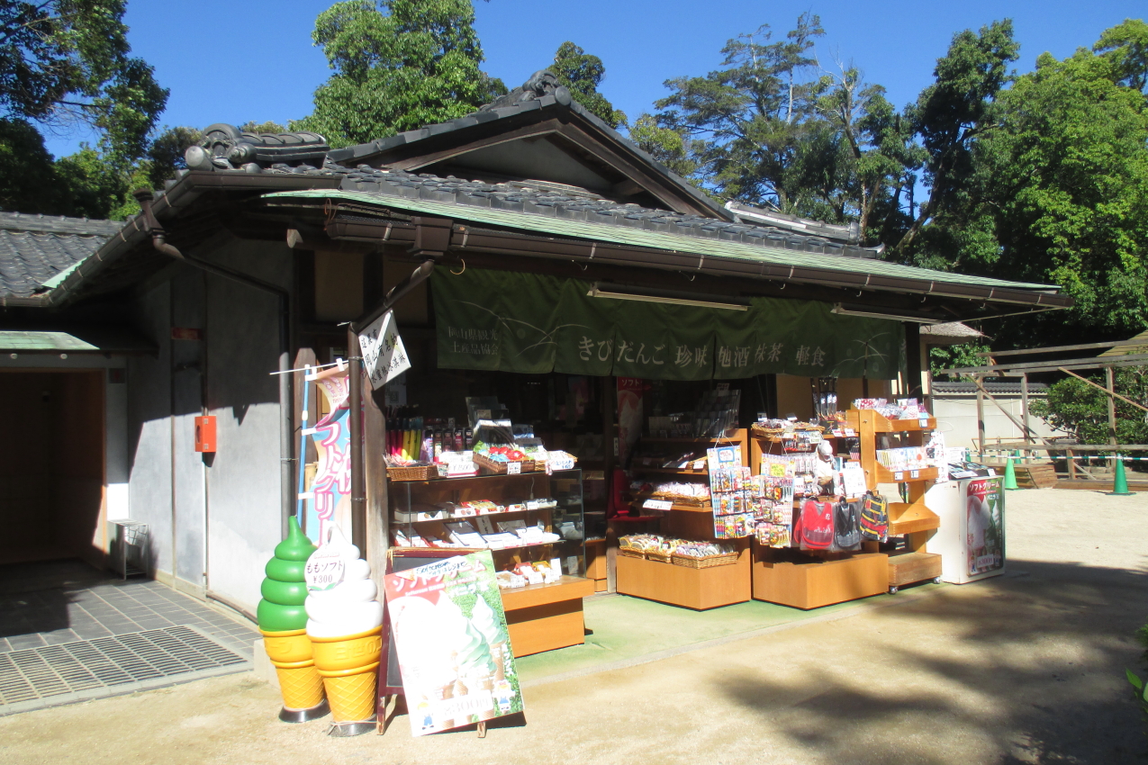 入園券売り場で貰った地図には観射亭と書かれた建物が正門を入ったすぐ左手奥にあります。そこに岡山県観光土産品協会の売店がありました。但し、観光土産品協会といった看板はあがっていません。和菓子などのお土産屋さんです。その奥に休憩場所になったところがありますが、元は弓場だったところの様です。売店のある建物はそれを観る建物で、観射亭と呼ばれていたのでしょう。