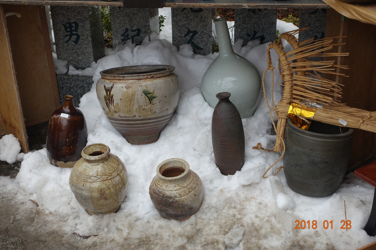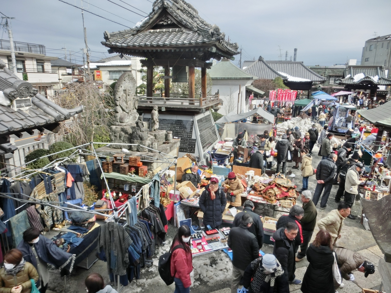 成田山川越別院の境内で毎月28日に開かれている蚤の市。一般のフリーマーケットと違って骨董関連などが多い。腕時計や古い玩具など趣味が合うものはひとつひとつひっくり返してじっくり見たい。古着や焼き物とか美術品も多い。