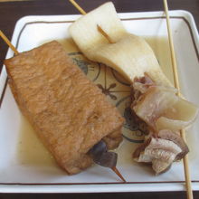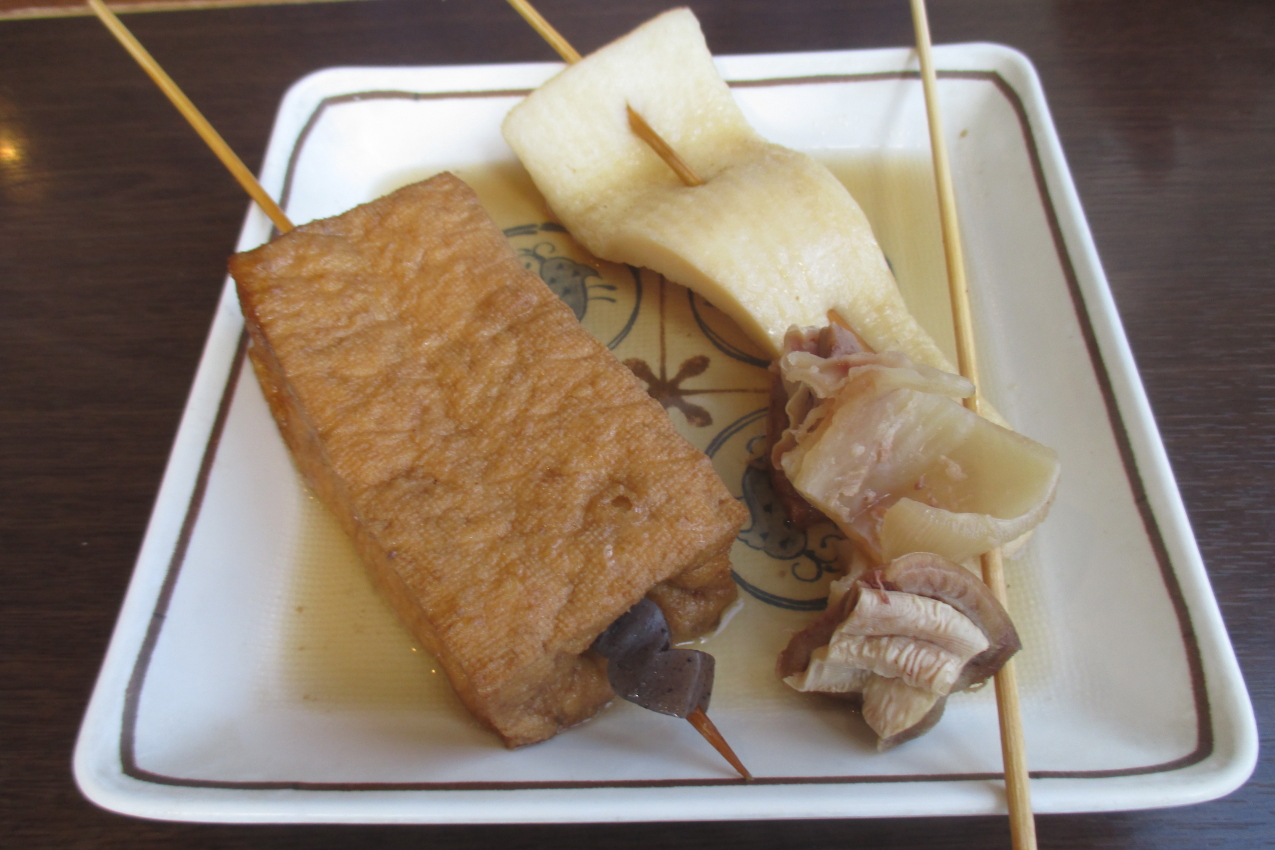 香川ではうどんやさんにおでんがあるのは普通?それともこのお店だけのことなのでしょうか?お店に入って行くと、大きなおでん鍋があり、串刺しのネタが美味しそうに煮えていました。自分で好きなものを取ってよい仕組みです。均一価格で、値段も130円とお手頃でした。初めての体験なので、ちょっと楽しかったです。